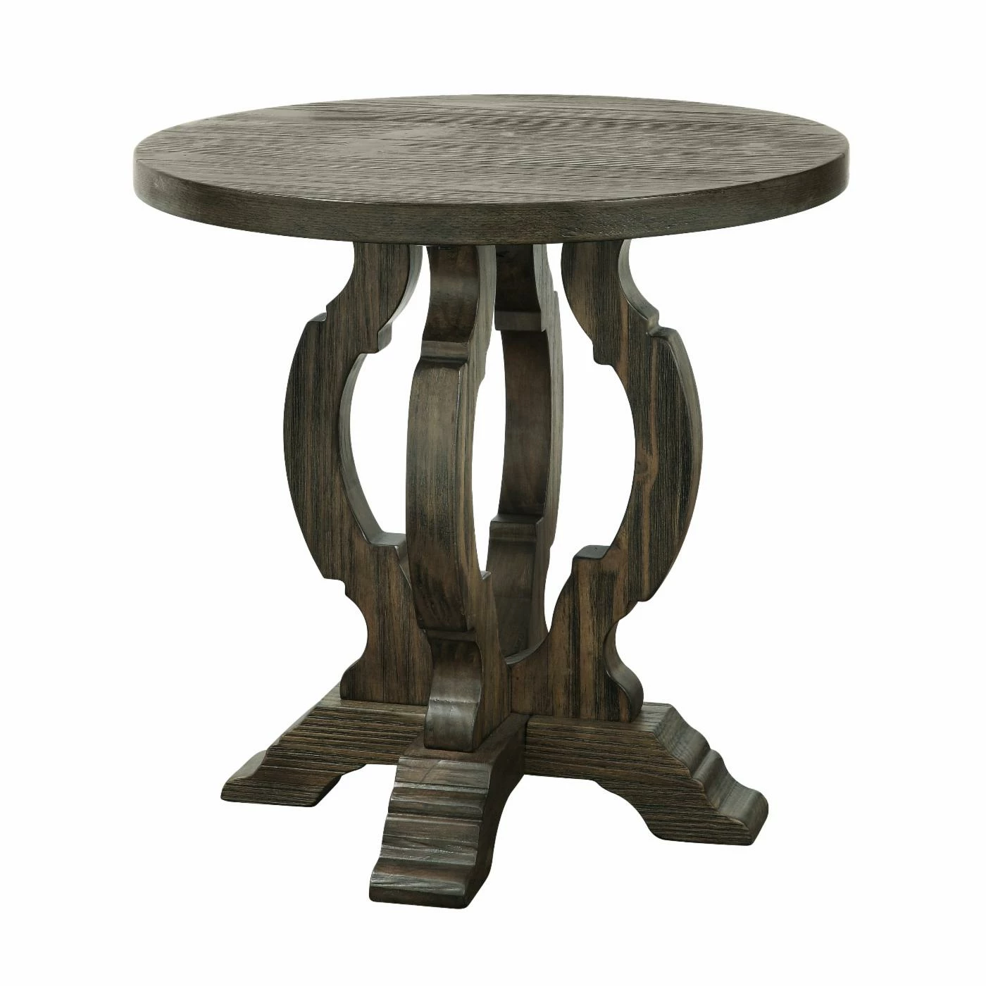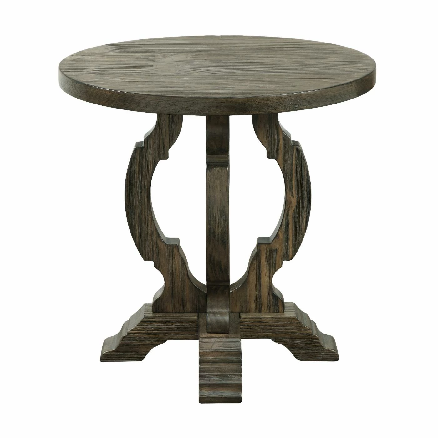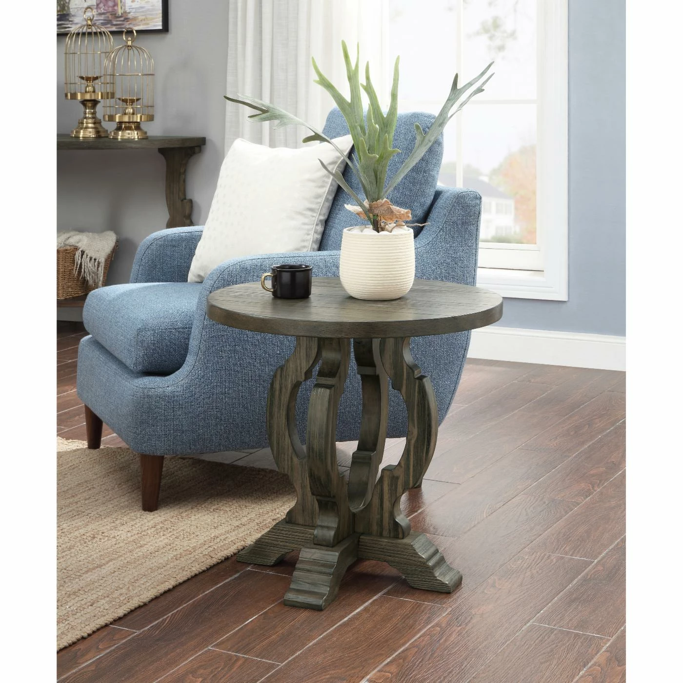 Top the Coast to Coast Orchard Park Round Accent Table with a sculpture or grand vase of arranged flowers to accent any room. This table features a curving, harp-inspired pedestal base and round wood plank top for a shabby-chic feel. For heirloom appeal, the accent table is finished in warm brown wood grain.
