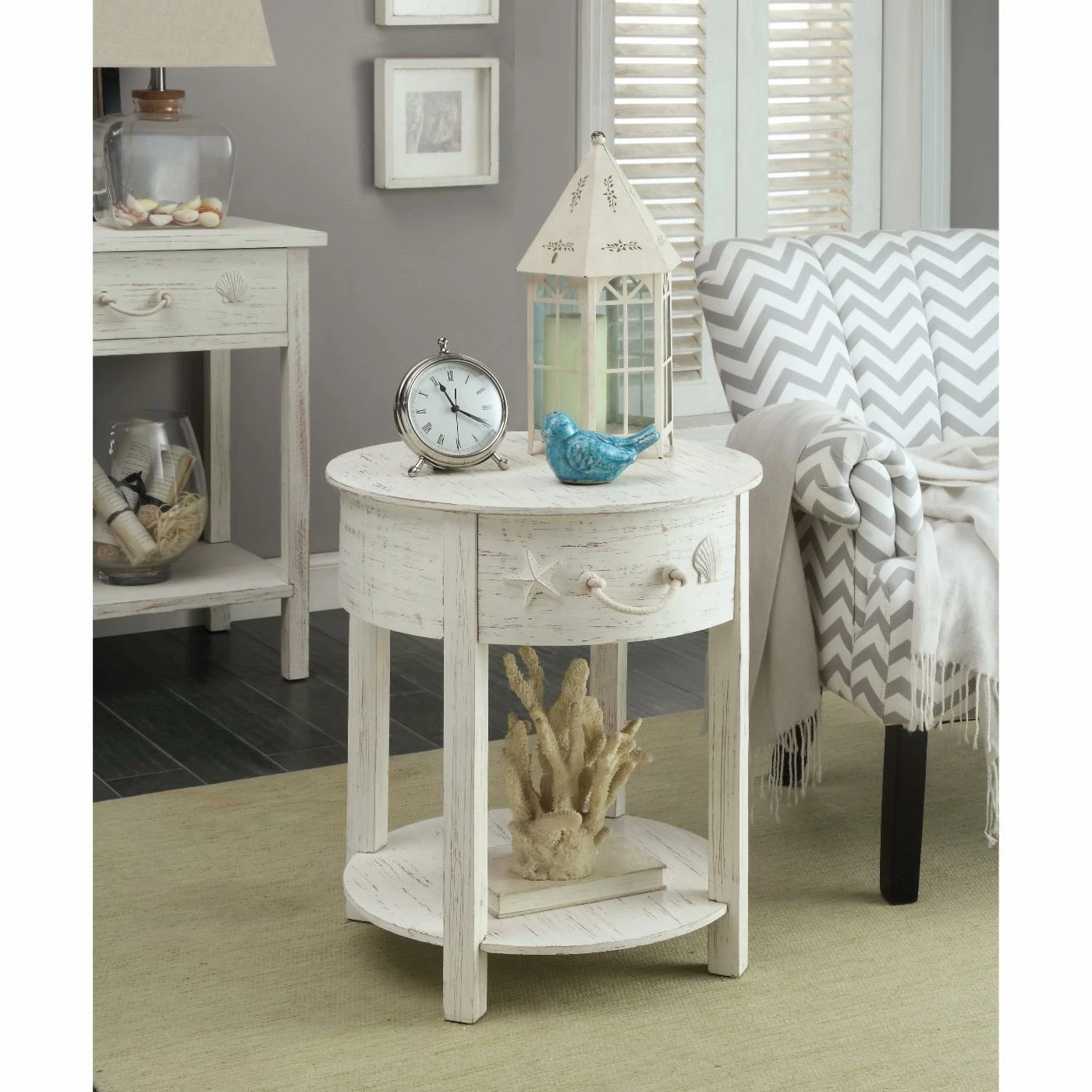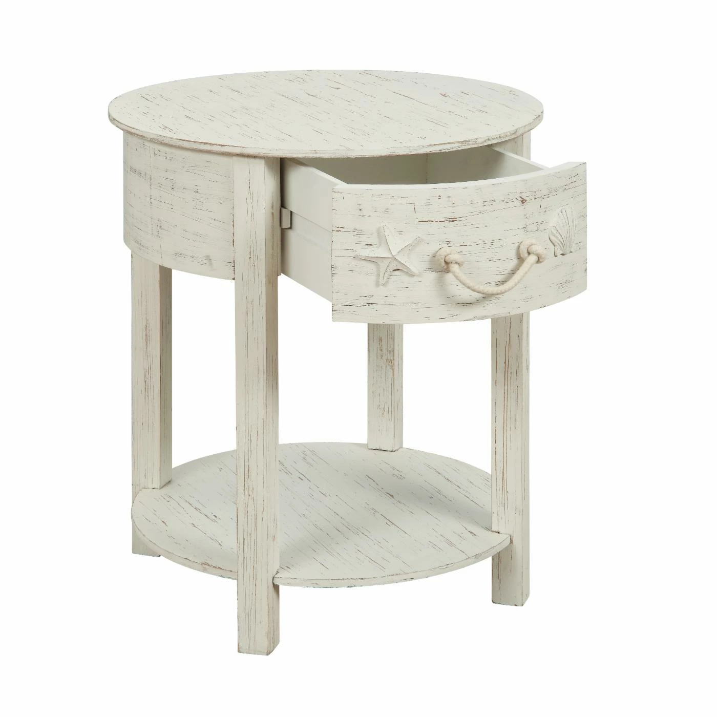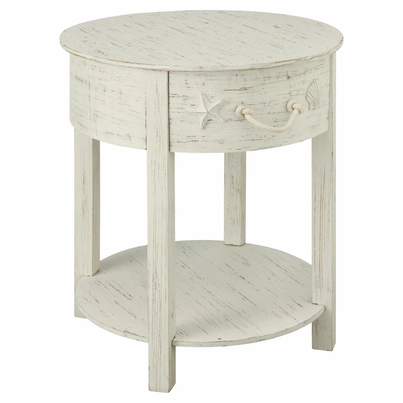 Life’s a beach, and your home can be too with the Coast to Coast Sanibel 1 Drawer End Table. The distressed white finish evokes the feel of a sandy shore, detailed with shells, starfish, and a rope handle to bring oceanic inspiration.