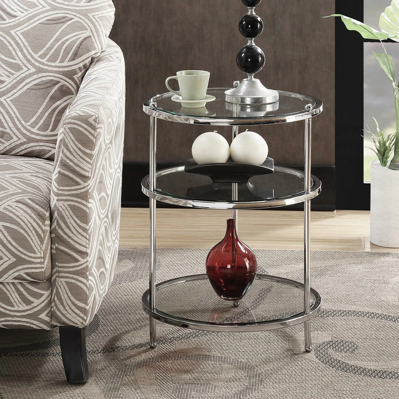 For a glamorous way to display favorite pieces and still have room for a lamp or reading material, choose the Convenience Concepts Royal Crest 3 Tier Round End Table as your new chair side companion. This round end table boasts three clear glass levels and a sturdy yet slim metal frame in gleaming polished chrome. It’s stylish enough to use as an accent table.
