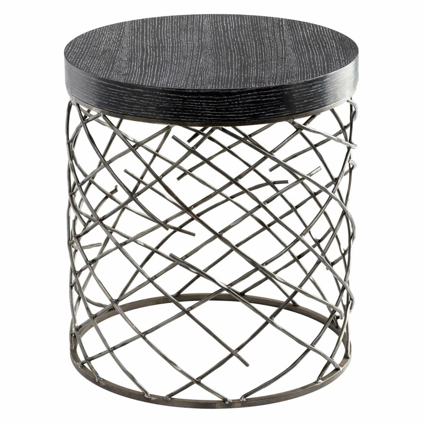 Twig-like iron rods crisscross along the base of the Cyan Design Marlow Table. This airy, open drum design helps to make compact contemporary seating areas feel more expansive. For added organic appeal, the wood tabletop shows off an exaggerated, black-painted grain effect.