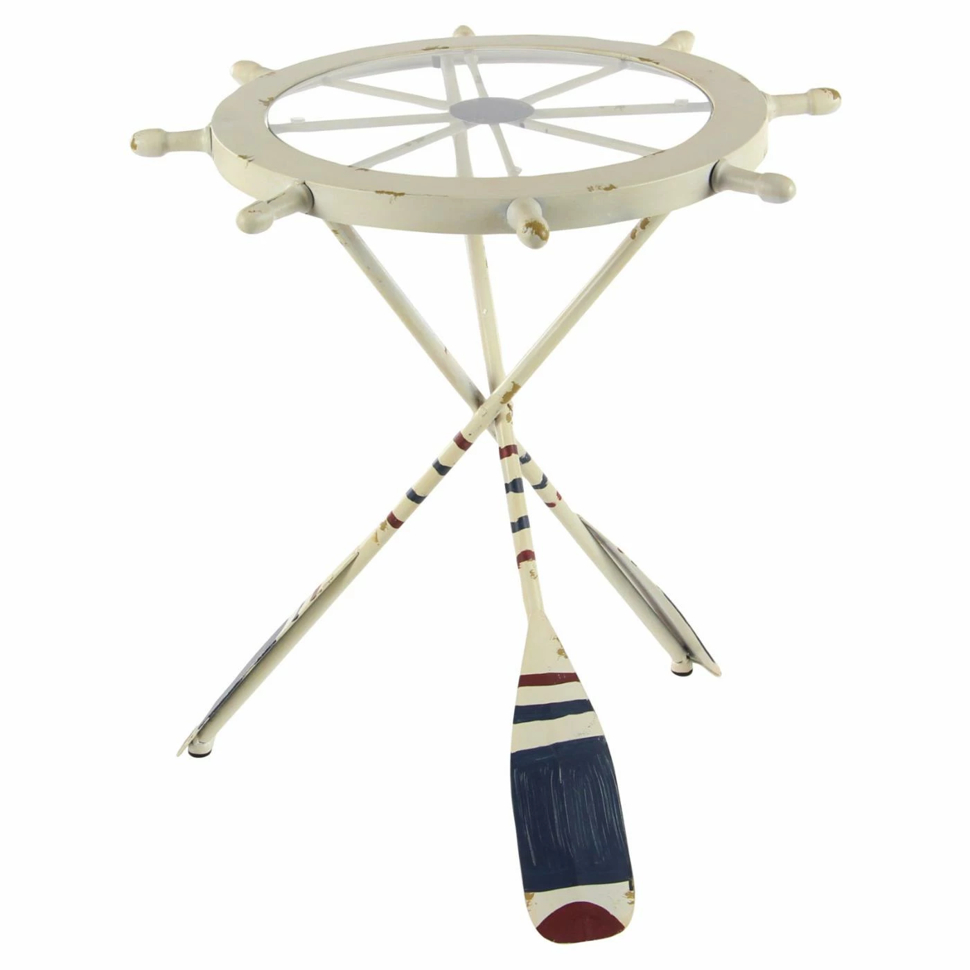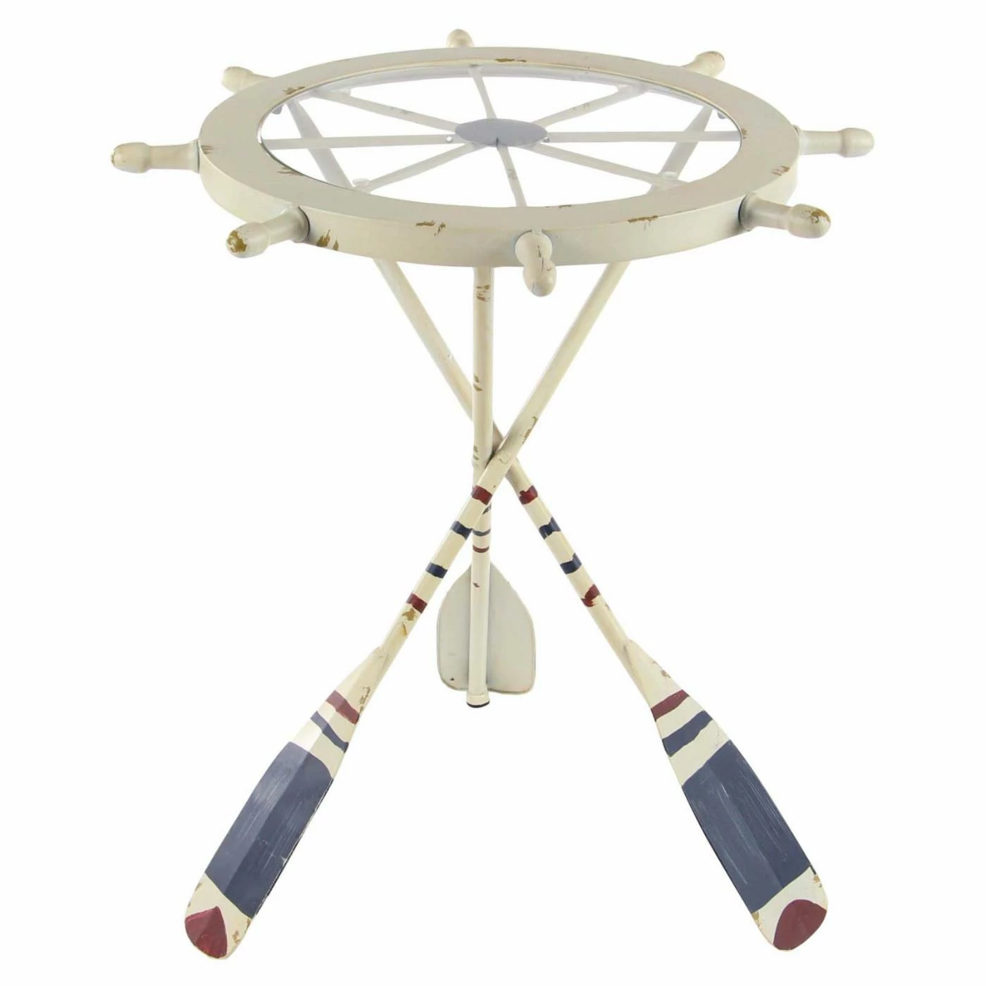 Nautical style will sail into your seating area when you display the DecMode Coastal Ship Wheel End Table beside your sofa or chair. The table features a tripod design with sculptural oar legs and a whimsical top that resembles a ship’s wheel. Clear tempered glass makes it easy to admire the details of the table from above.