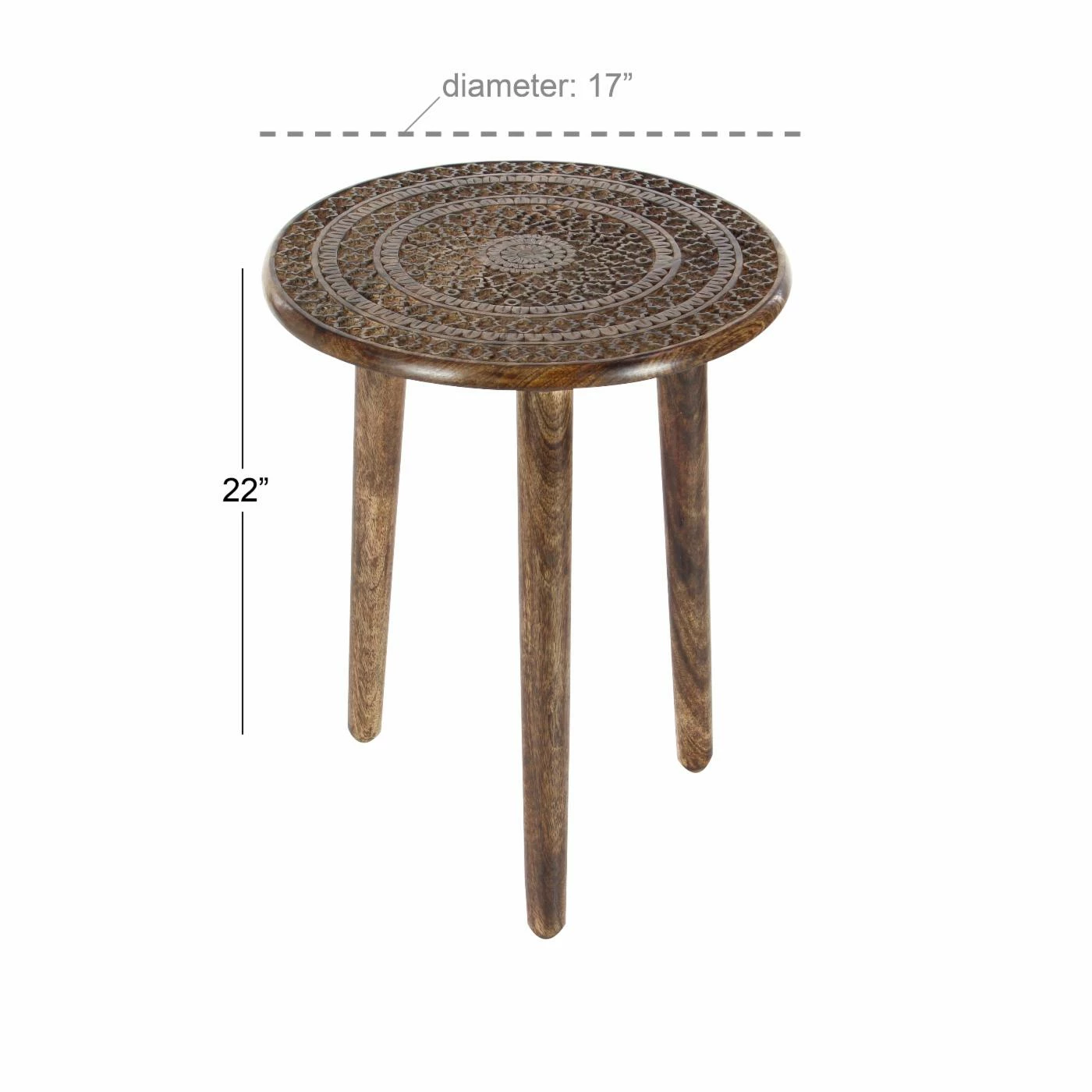 The charming DecMode Medallion Tripod Accent Table is a refined and stunning statement piece that gives a rich look to your home. An accent dΓ©cor piece which features a brown finish, exposed wood grain, and round table top with carved floral mandala design. Made of natural mango wood, this stunning table is both stylish as well as practical. Itβs the right choice for spaces with modern and contemporary interiors.