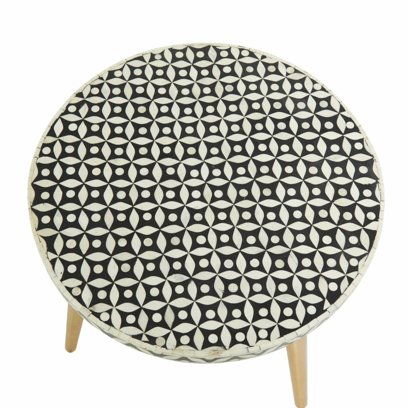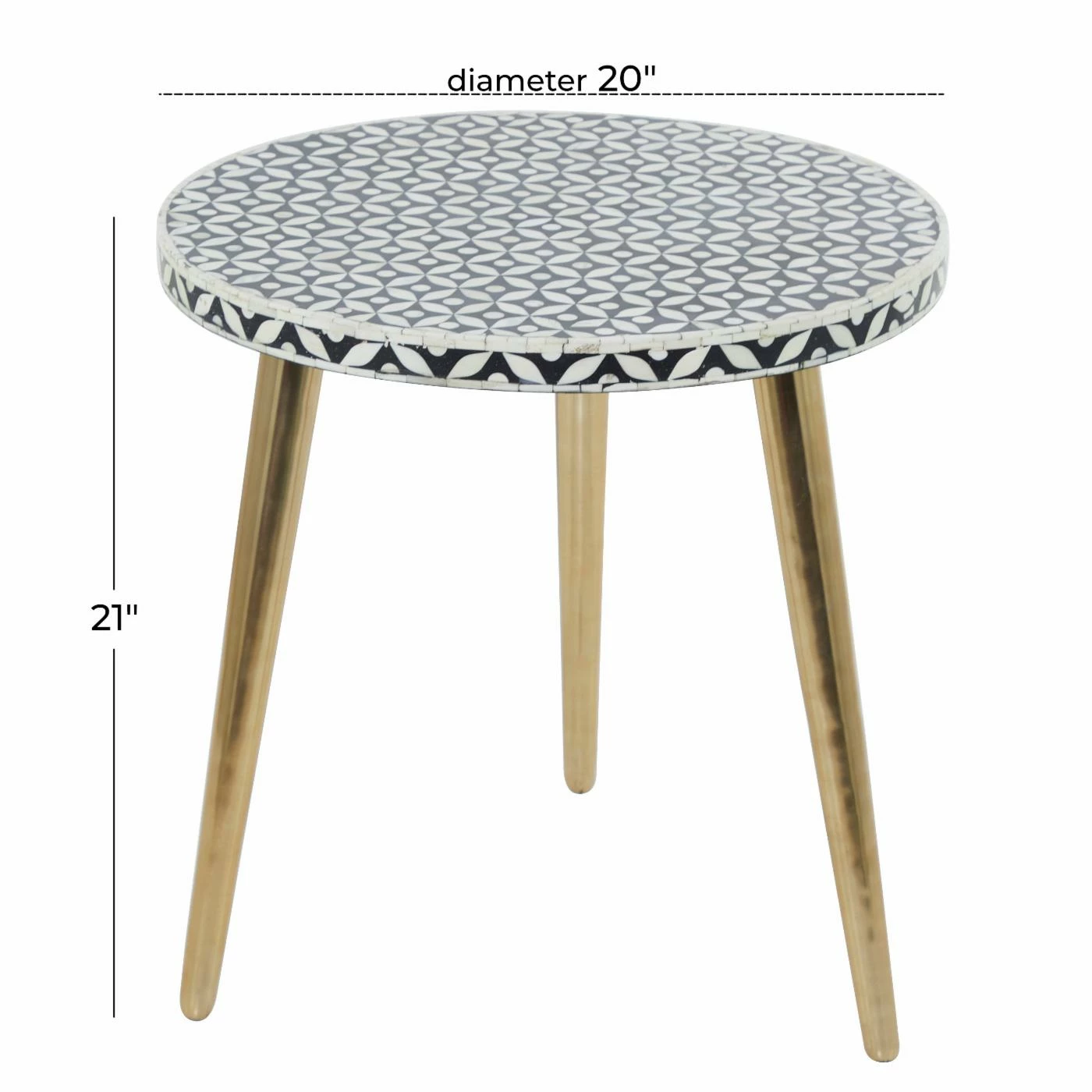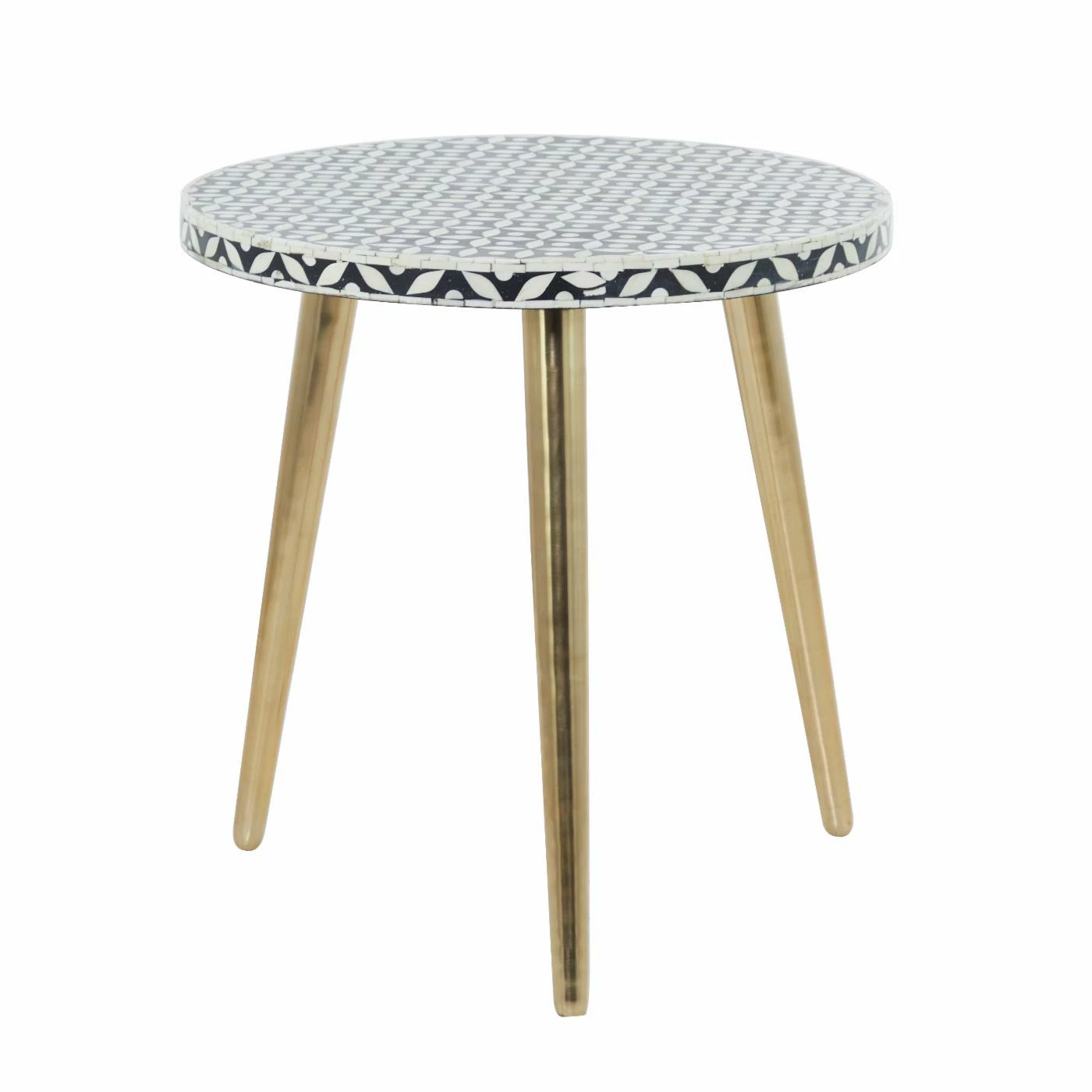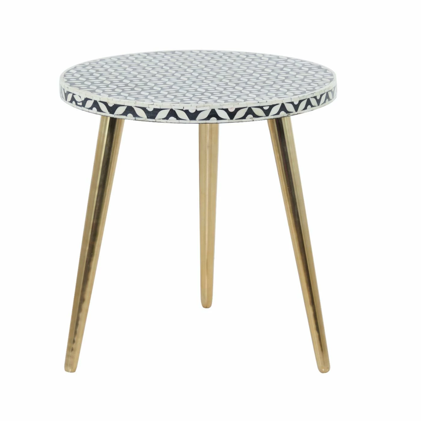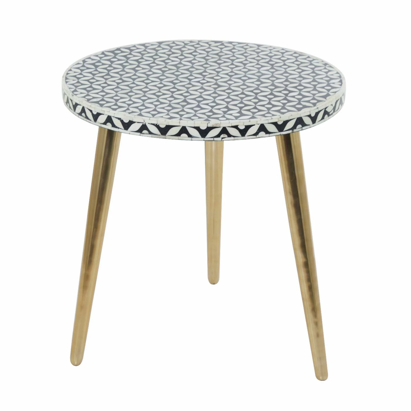 - This round side table has a patterned black and white tabletop designed with buffalo bones and a reflective gold base