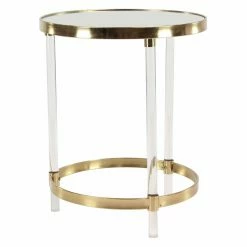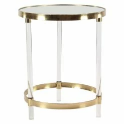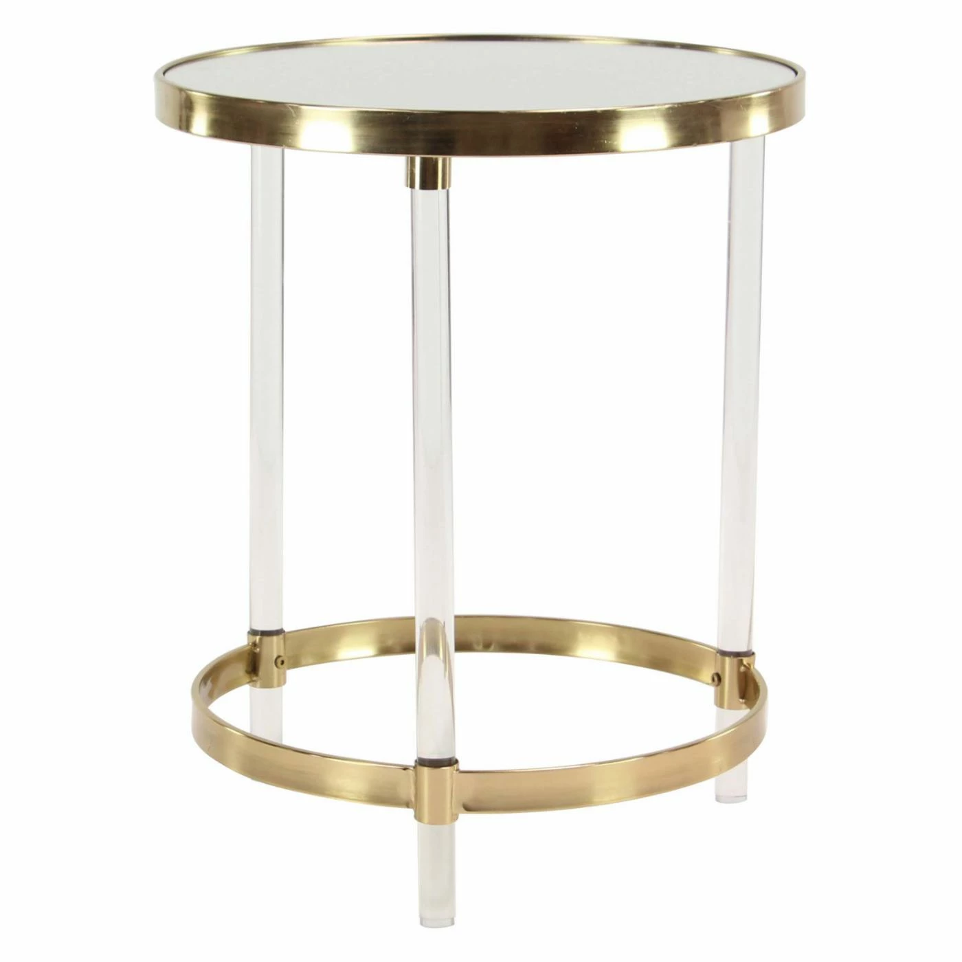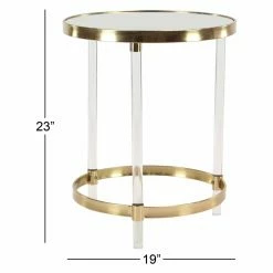 The DecMode Modern Round Iron and Acrylic Accent Table features a sleek, contemporary design with metallic touches. The round, mirrored tabletop is supported by clear acrylic legs. A gold-finished iron band encircles the legs for a hint of shine. Display this accent table next to a couch, chair, or bed.