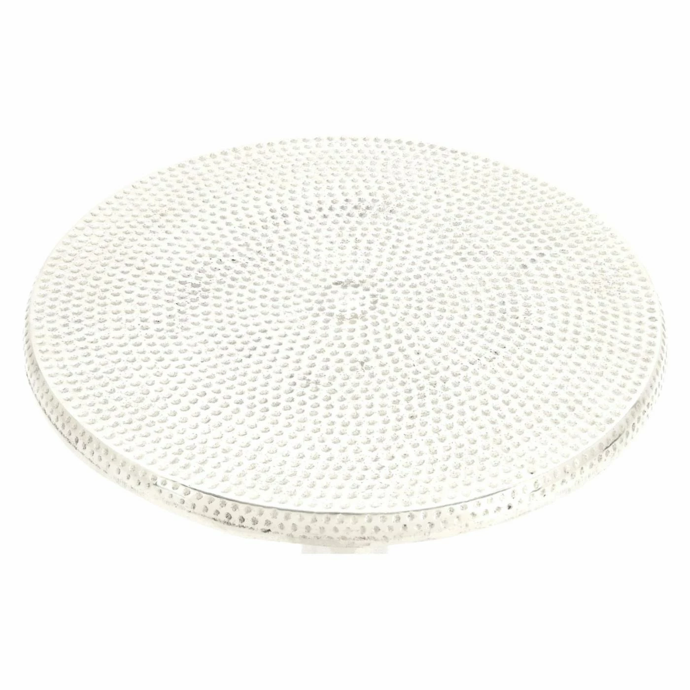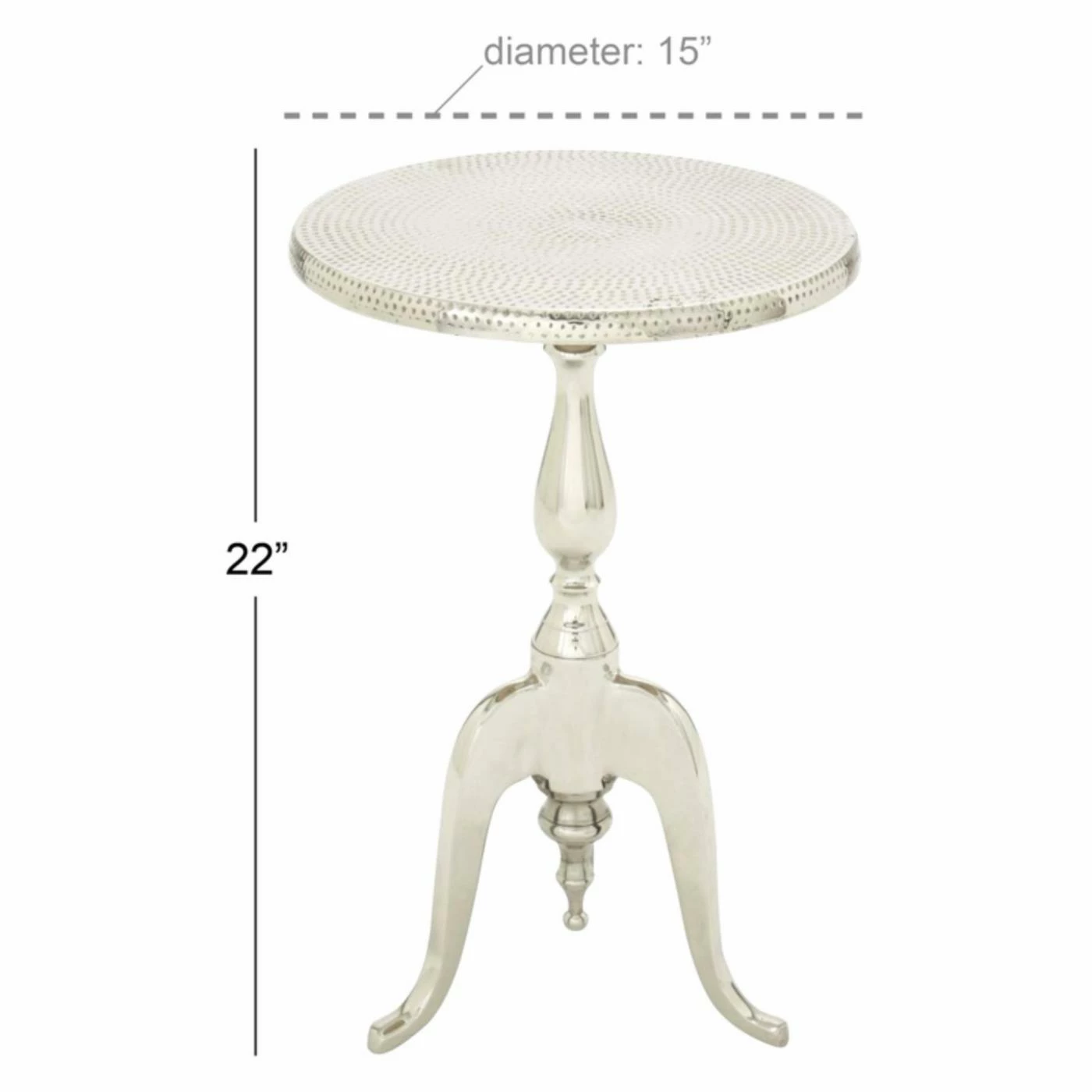A mix of textures gives the DecMode Pedestal Round Accent Table an appealing look that adds flair to interiors. The all-aluminum table has a dimpled, round top with its textured finish extending over the overhang along the sides. Polished to perfection, the elegant base reflects the light for a brilliant shine and has a traditional look with a ball finial-capped teardrop post and shapely tripod legs.