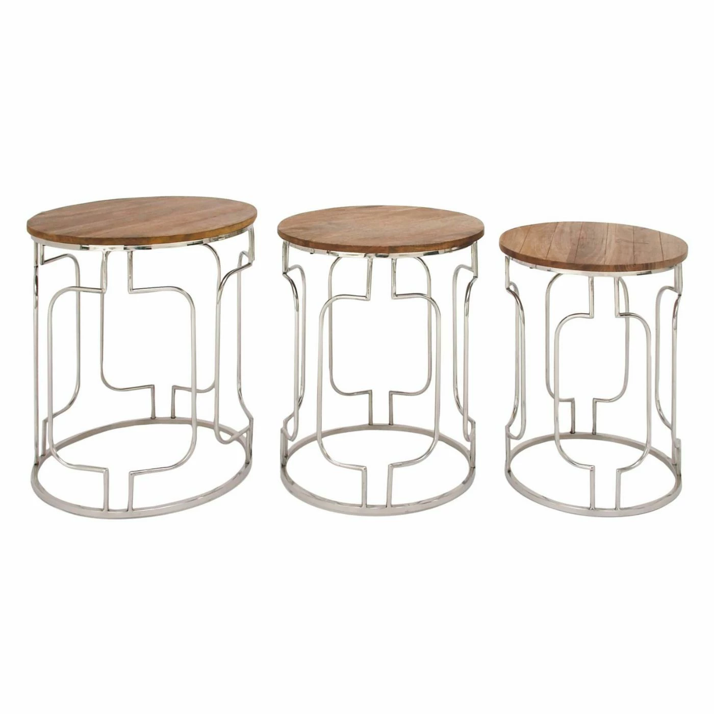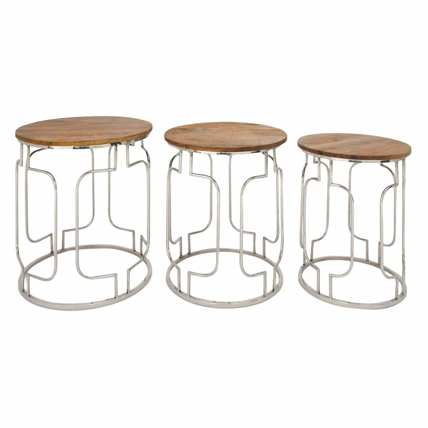 Open, polished steel frames with geometric cut-outs give the DecMode Round Mango Wood Tables With Cut-Out Frame – Set of 3 its modern appeal. Round mango wood tops lend an organic feel. This set includes three round accent tables perfect for using individually or bunching them to form a customized cocktail table.