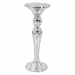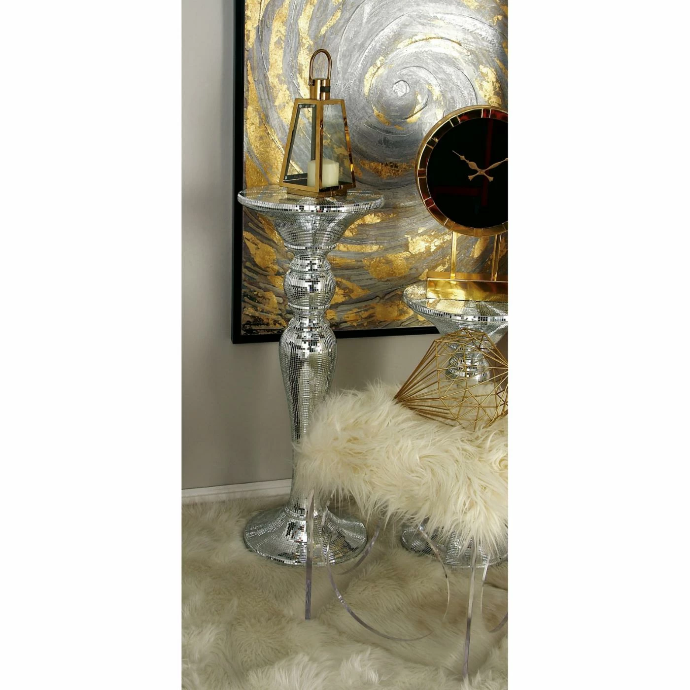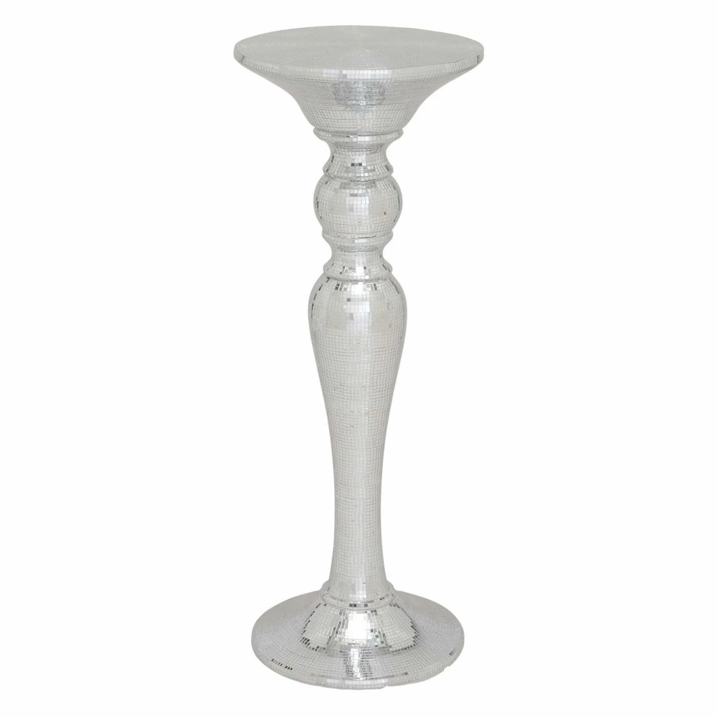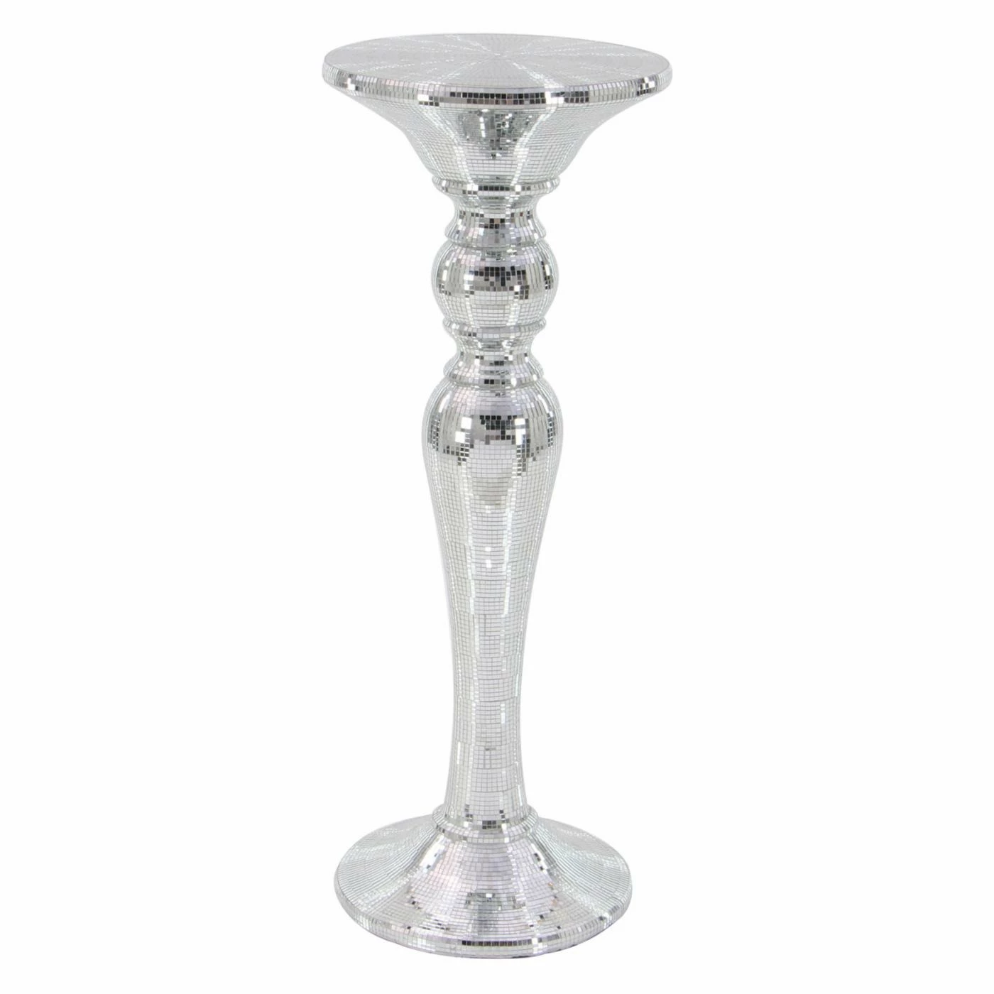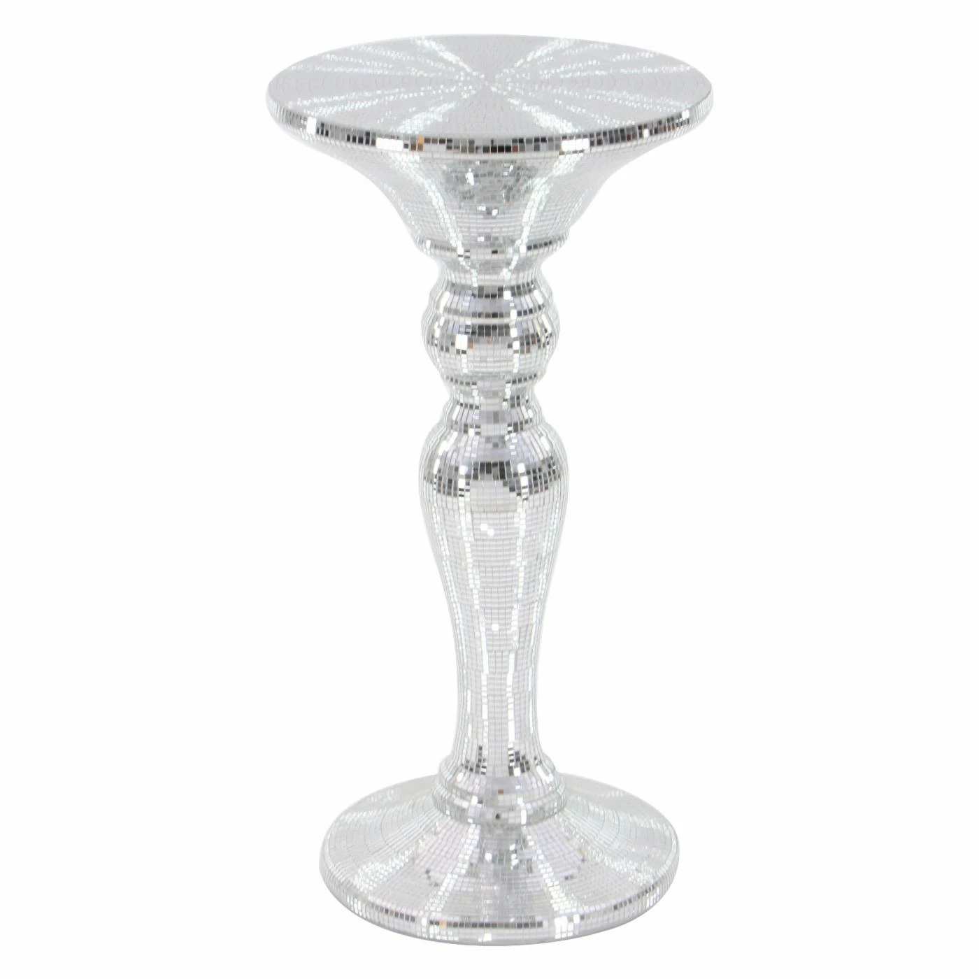 Every surface of the curvaceous DecMode Round Mirrored Pedestal End Table is lined in shimmering polished mirror tiles. Its round top offers a flat surface that makes this dazzling bit of glamour a functional end table.