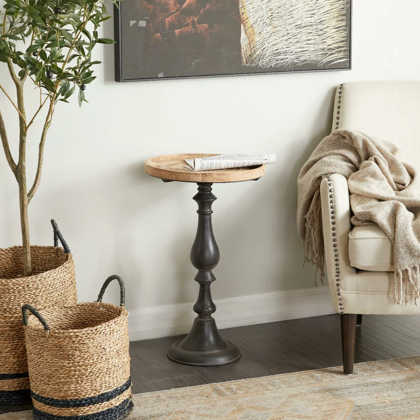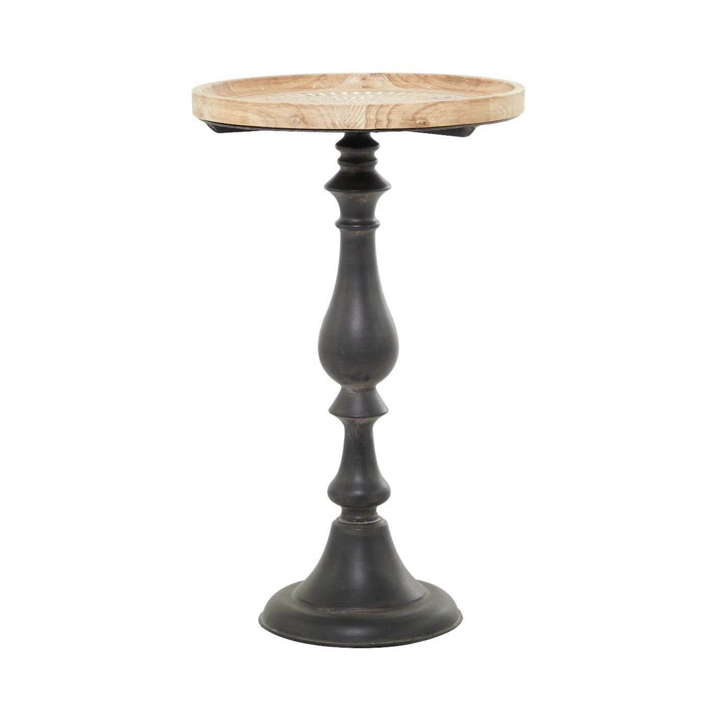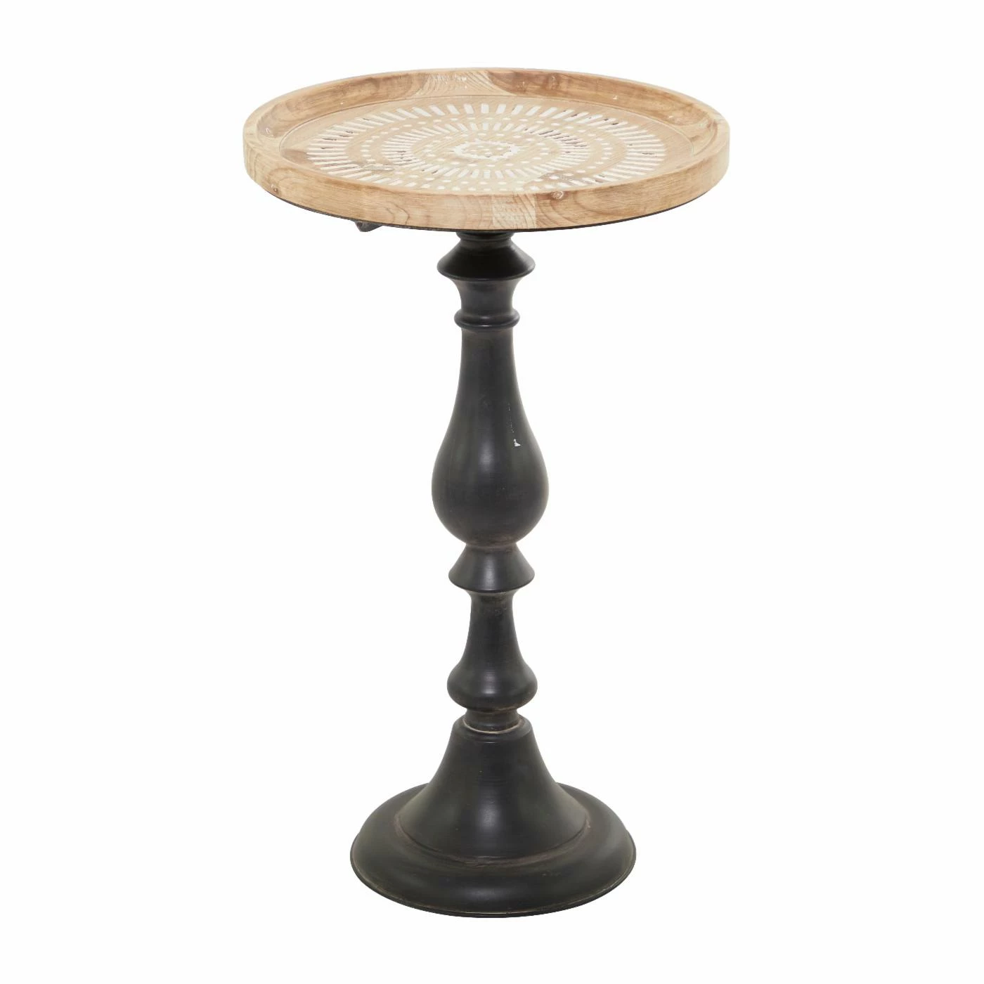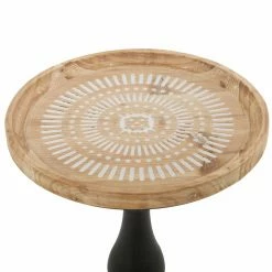 - Decorative accent table that comes in brown surface with white abstract pattern and black pedestal stand