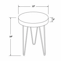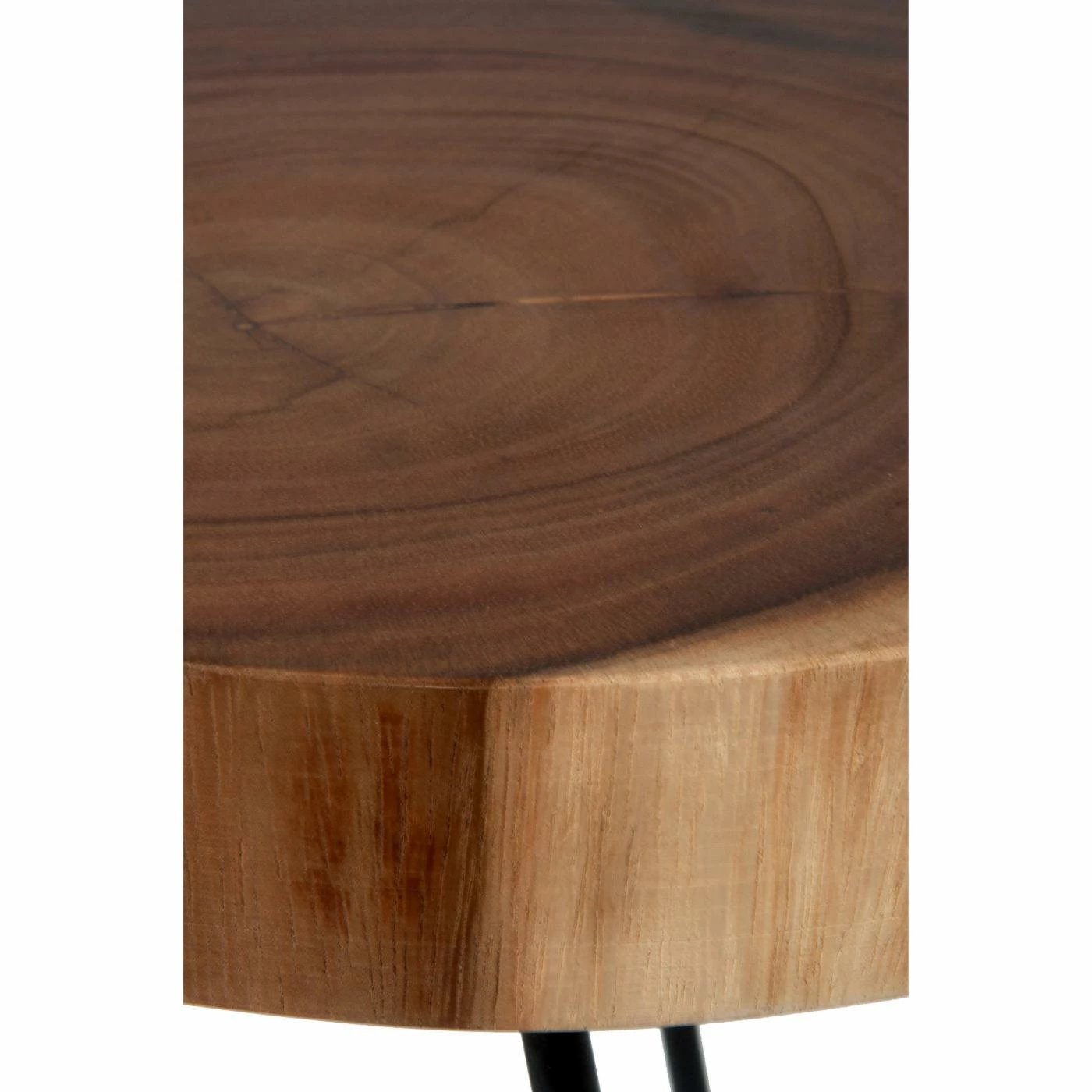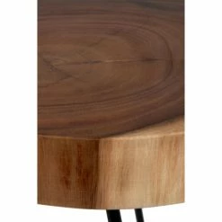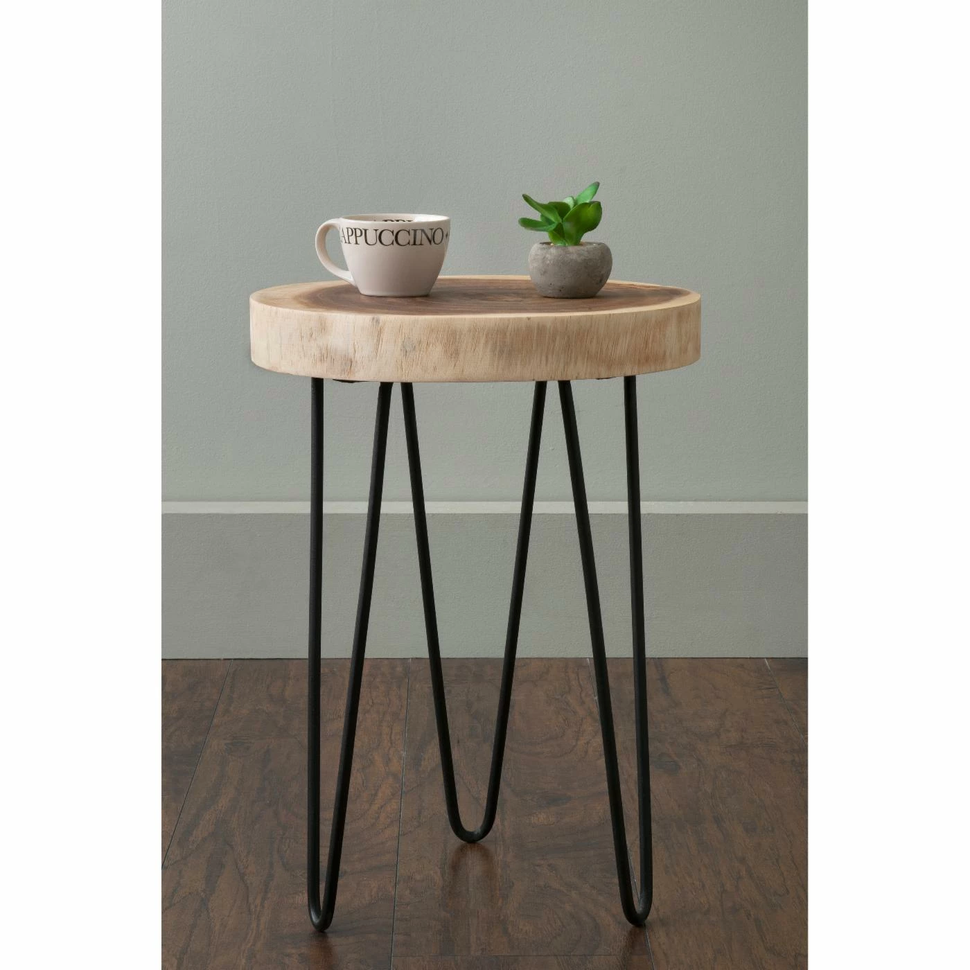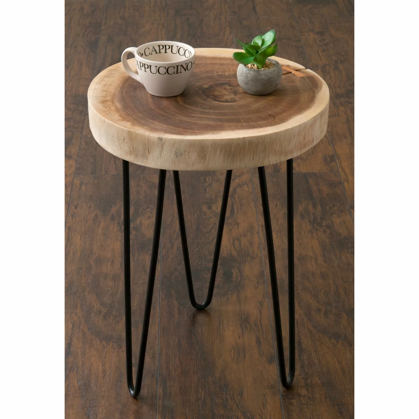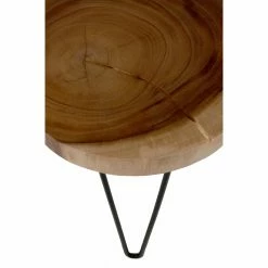 Organic design gets a modern makeover in the East At Main Laredo Teakwood Round Accent Table. The tabletop is a cross-cut section of tree trunk for a decidedly rustic appearance. Hairpin metal legs offer structure and support. Set this accent table in your living room or bedroom to hold lamps, framed photos, vases, and other items.