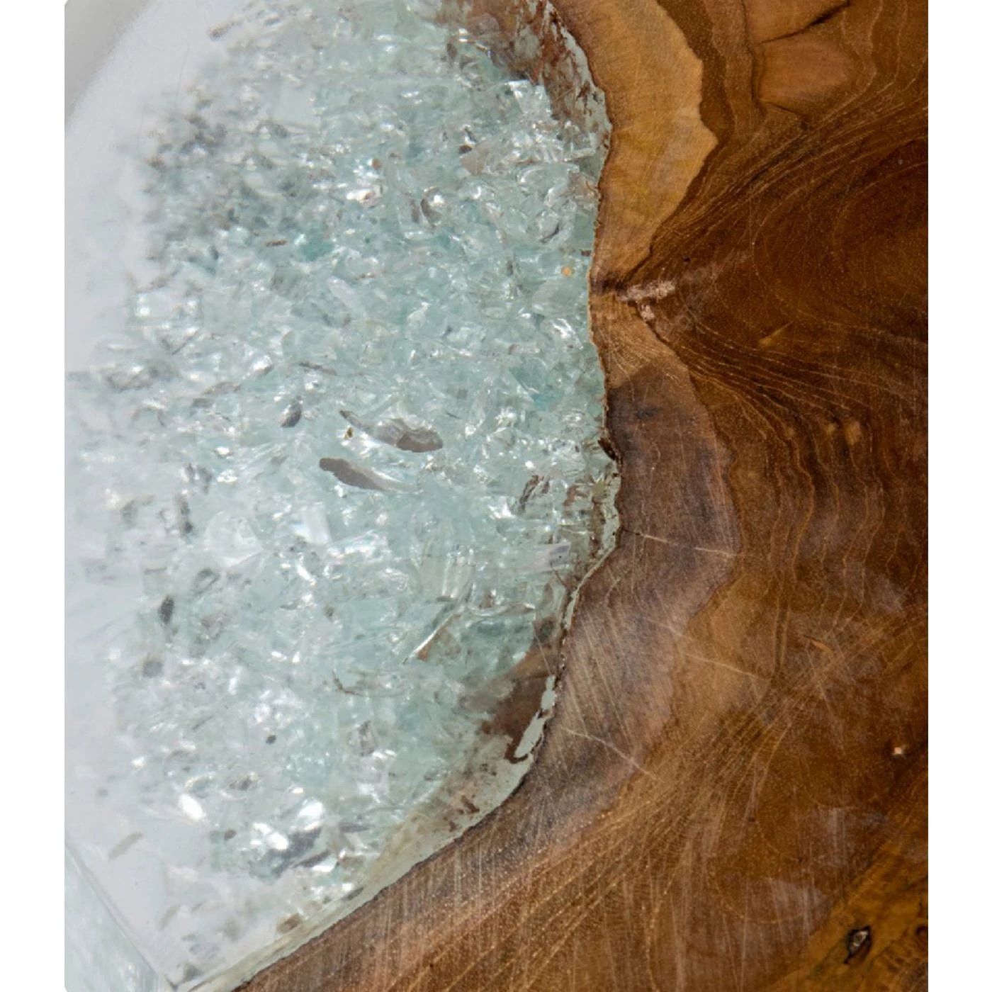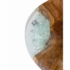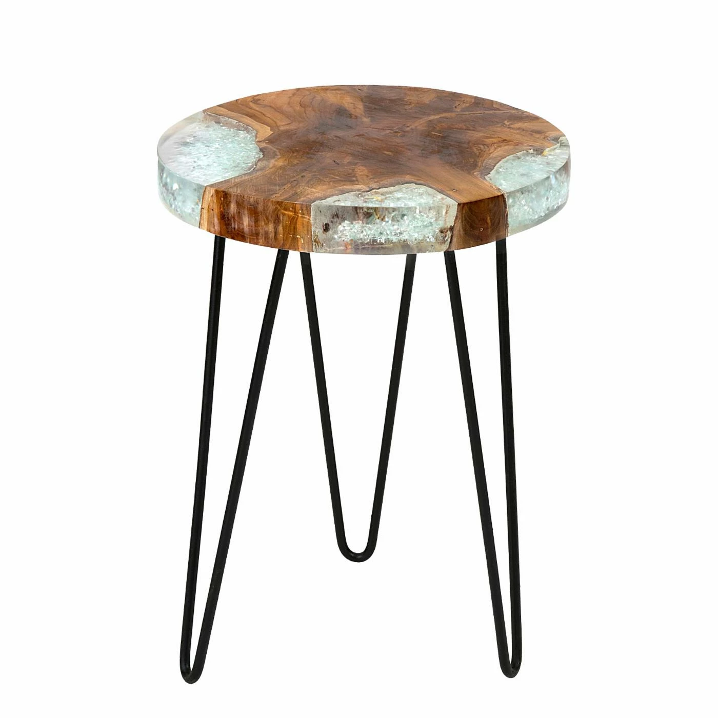 Bring contemporary-chic style to your living room or den with this sleek accent table. A slab of recycled teak wood is cut and filled with acrylic to create a “crystal-filled” aesthetic. Perched on sleek black iron hairpin legs, this table has a modern silhouette. The natural crevices and imperfections of the wood showcase an organic and unique look. Each piece has its very own distinct character. Pair with a comfy couch and loveseat for a living room that is ready to entertain!