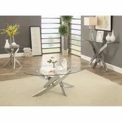 The Furniture of America Myron Contemporary Style Chrome Base End Table features a unique base of sturdy metal in an artistically appealing crisscross, splayed design. This end table has a smooth, tempered glass tabletop with beveled edges that resist chipping and wear for a new look that lasts over the years. A shimmering chrome finish enhances the overall appeal of this sophisticated table.