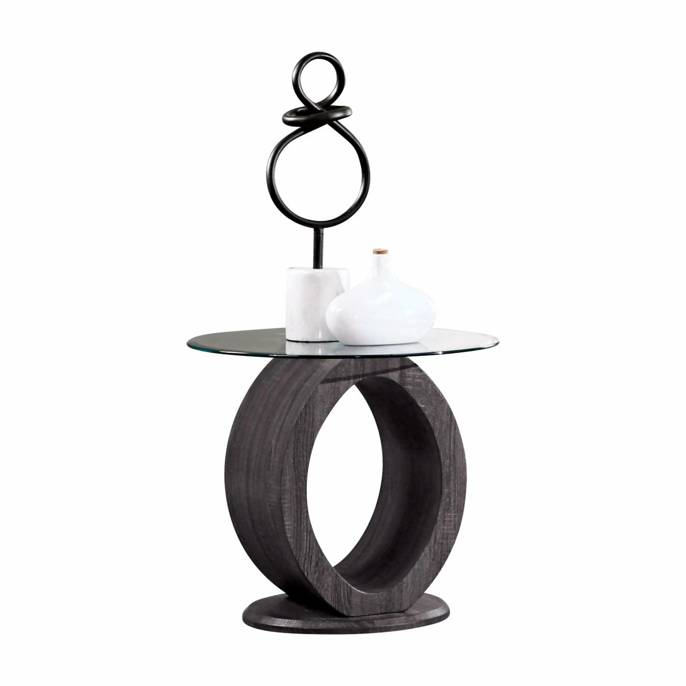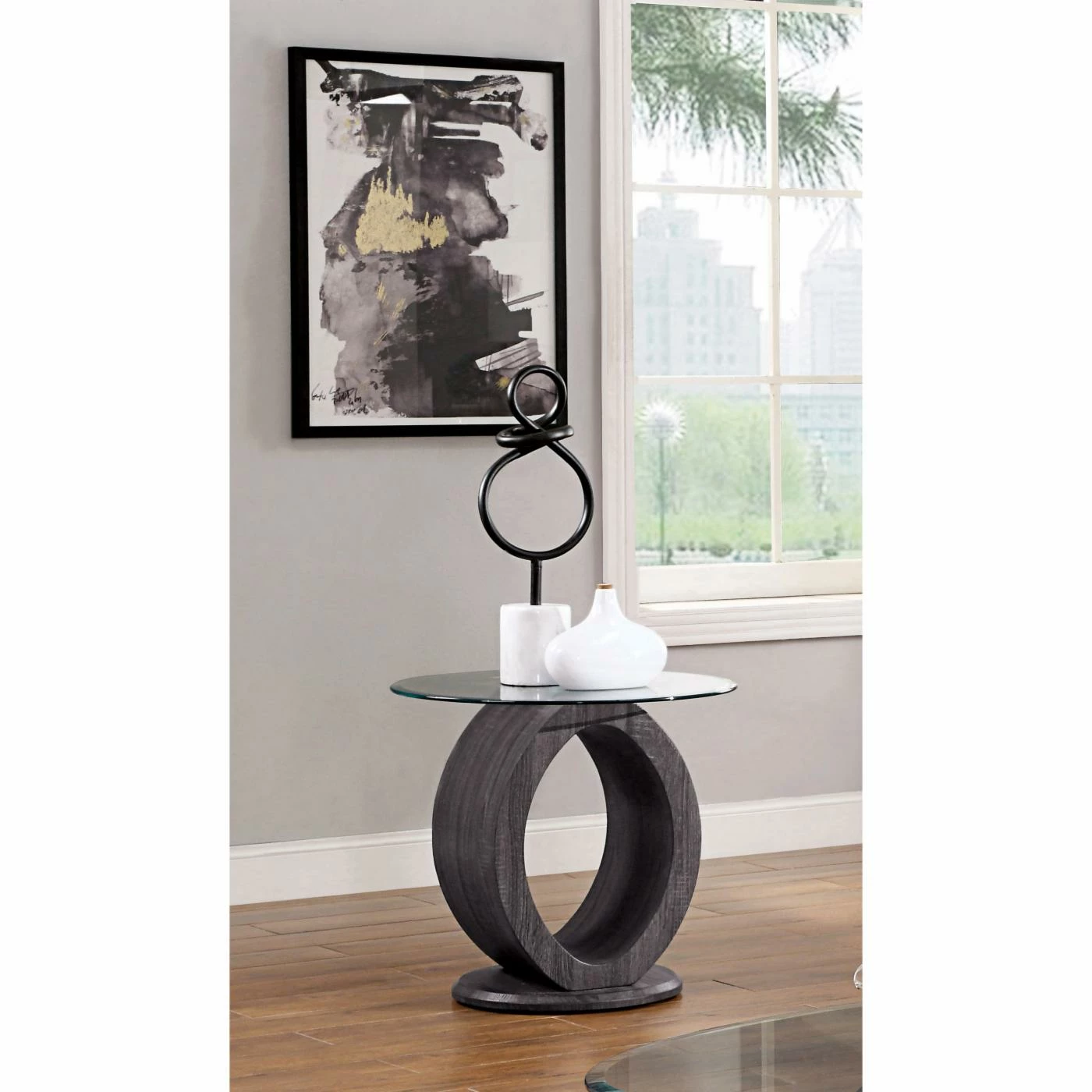 The Furniture of America Norman O Shaped End Table is an occasional table with a difference. This table features an elliptical motif throughout, from its glass tabletop to the wooden base. The tabletop is made from tempered glass, so it’s stronger than normal, scratch resistant, break resistant, and offers a crystal clear clarity. The open, vertical O-shaped space in the base could be used for storing blankets, books, or small knick knacks. Consider the Norman O Shaped Sofa Table as a matching piece.