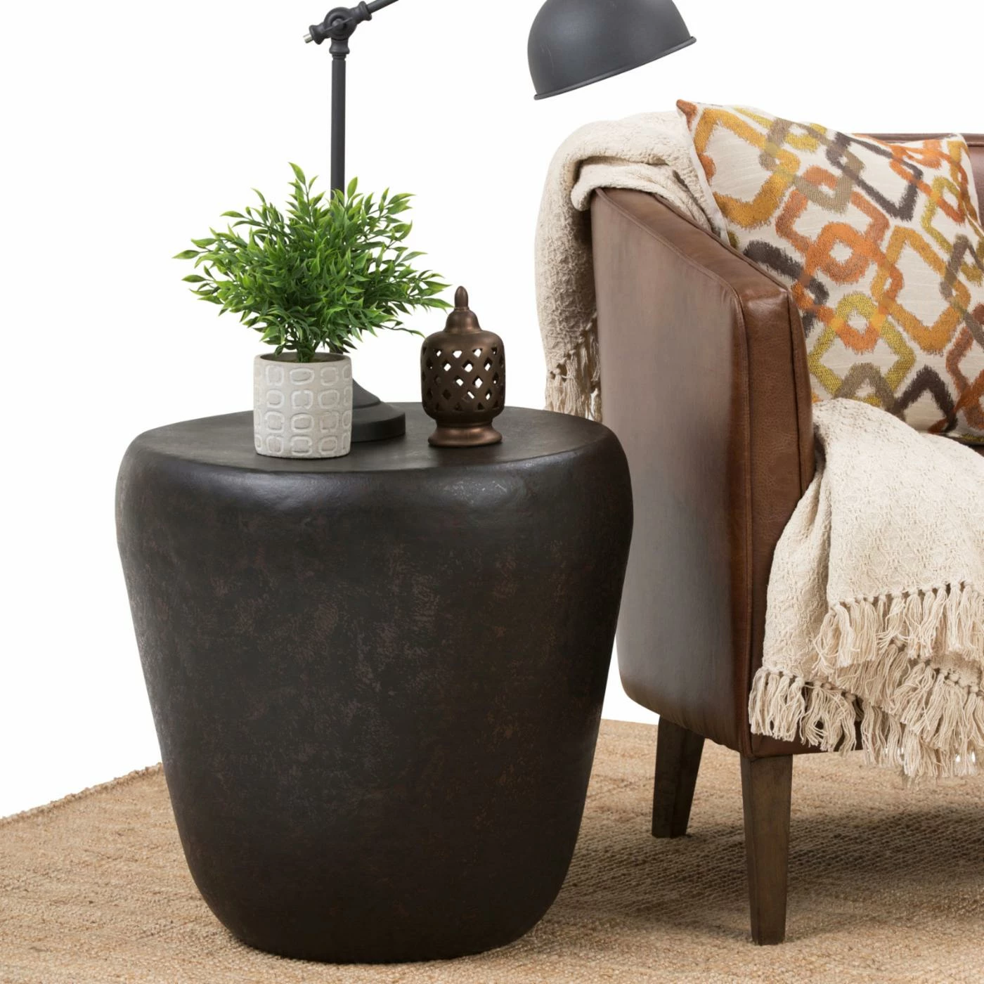 Give your living room a natural feel with the HN Home Kimball Modern Farmhouse Metal Accent Drum Side Table. This metal side table has a hand-aged rustic finish and a drum shape. This piece is ideal for holding plants, lamps, or dΓ©cor.