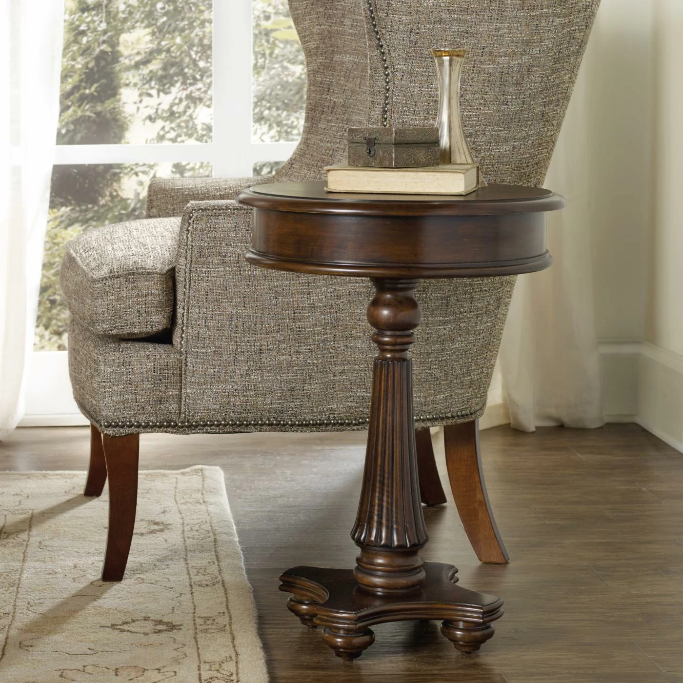 The handsome Hooker Furniture Leesburg Martini Table fulfills a practical role while enhancing your space. Perfect for traditional interiors, this round martini table stands on a reverse-tapered, fluted pillar. Magnificent mahogany veneers take on a marbled appearance due to the richness of the natural grain patterns.
