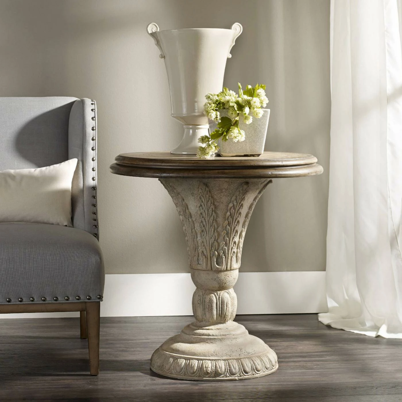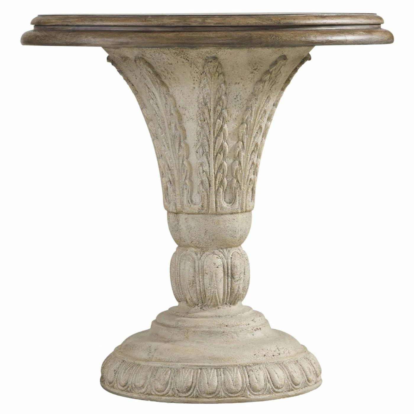 The urn shape and off white finish of the Hooker Furniture Solana Round Accent Table showcases a traditional style worthy of any home. The textured base highlights the round table top beautifully.
