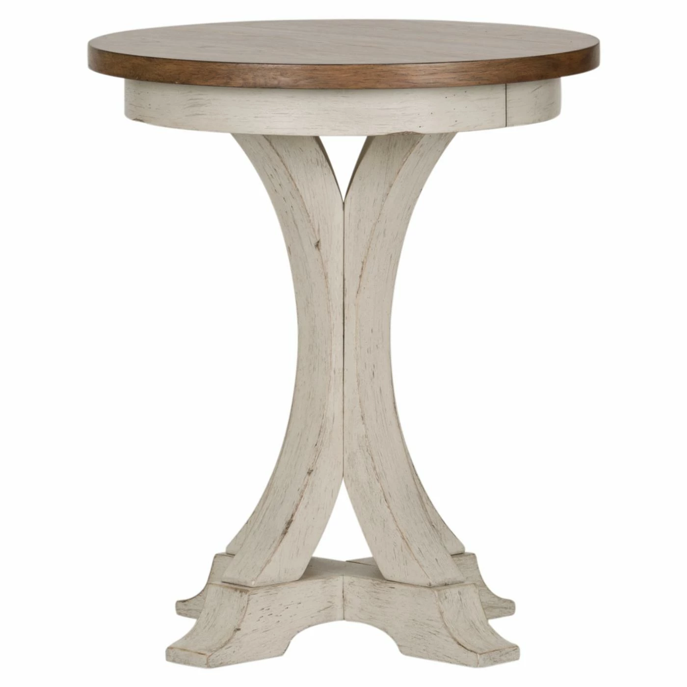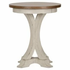 Capture a rustic cottage aesthetic with the Liberty Furniture Industries Farmhouse Reimagined Round Chair Side Table. This side table features a round chestnut tabletop and an elegantly curved pedestal base adorned with a whitewash finish. It makes a versatile addition to the den or living room as a place to set a lamp, potted plant, or decorations, and it will imbue your dΓ©cor with a charming farmhouse style.