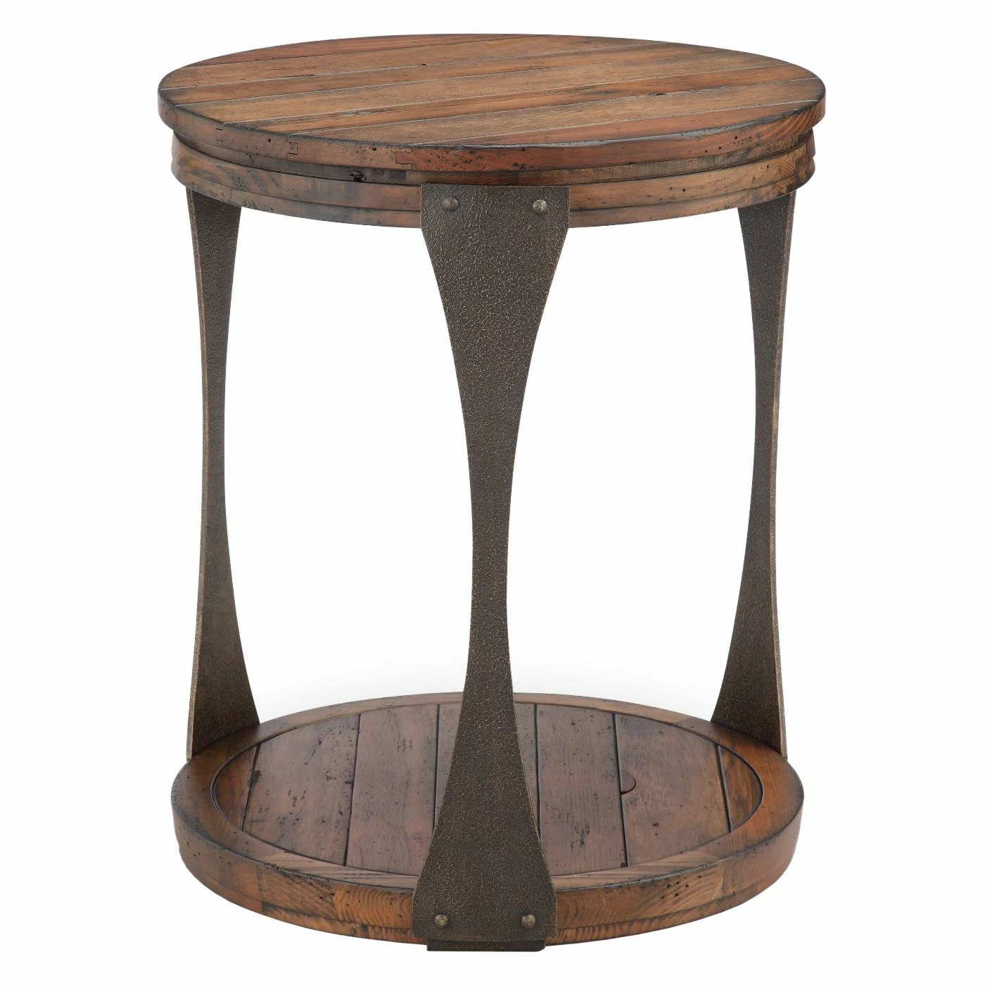 Bring a rustic touch to any room with the Magnussen Montgomery Reclaimed Wood Round Accent Table. This end table is crafted of reclaimed wood in a bourbon finish. It features a lower open shelf ideal for displaying magazines, books, and collectibles. Iron metal accents embellish this round end table adding to its restorative design.