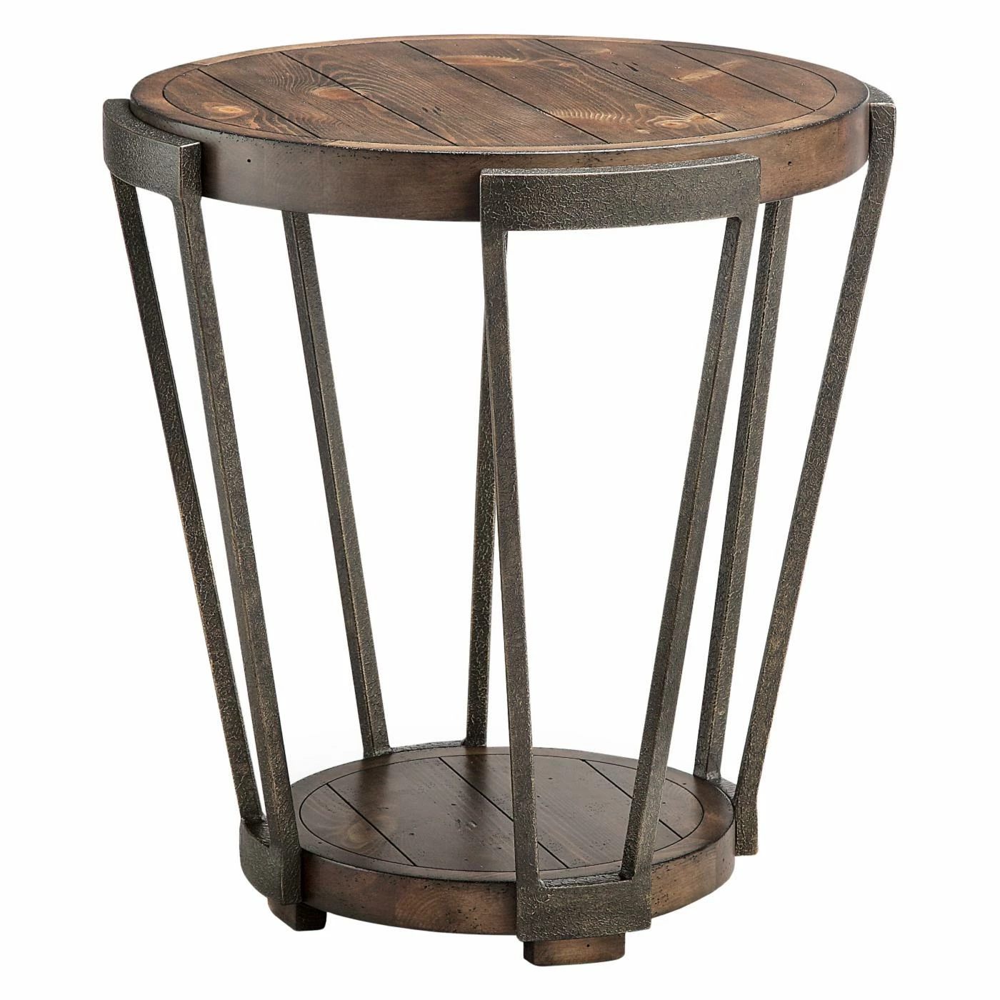 The Magnussen Yukon Industrial Round End Table seamlessly blends rustic and industrial together thanks to a barrel-shaped silhouette along with elements of wood and metal. This dramatic end table features angled metal accents crafted in a gray, aged iron finish. The wood top and bottom feature a rich bourbon finish for a bold final touch.