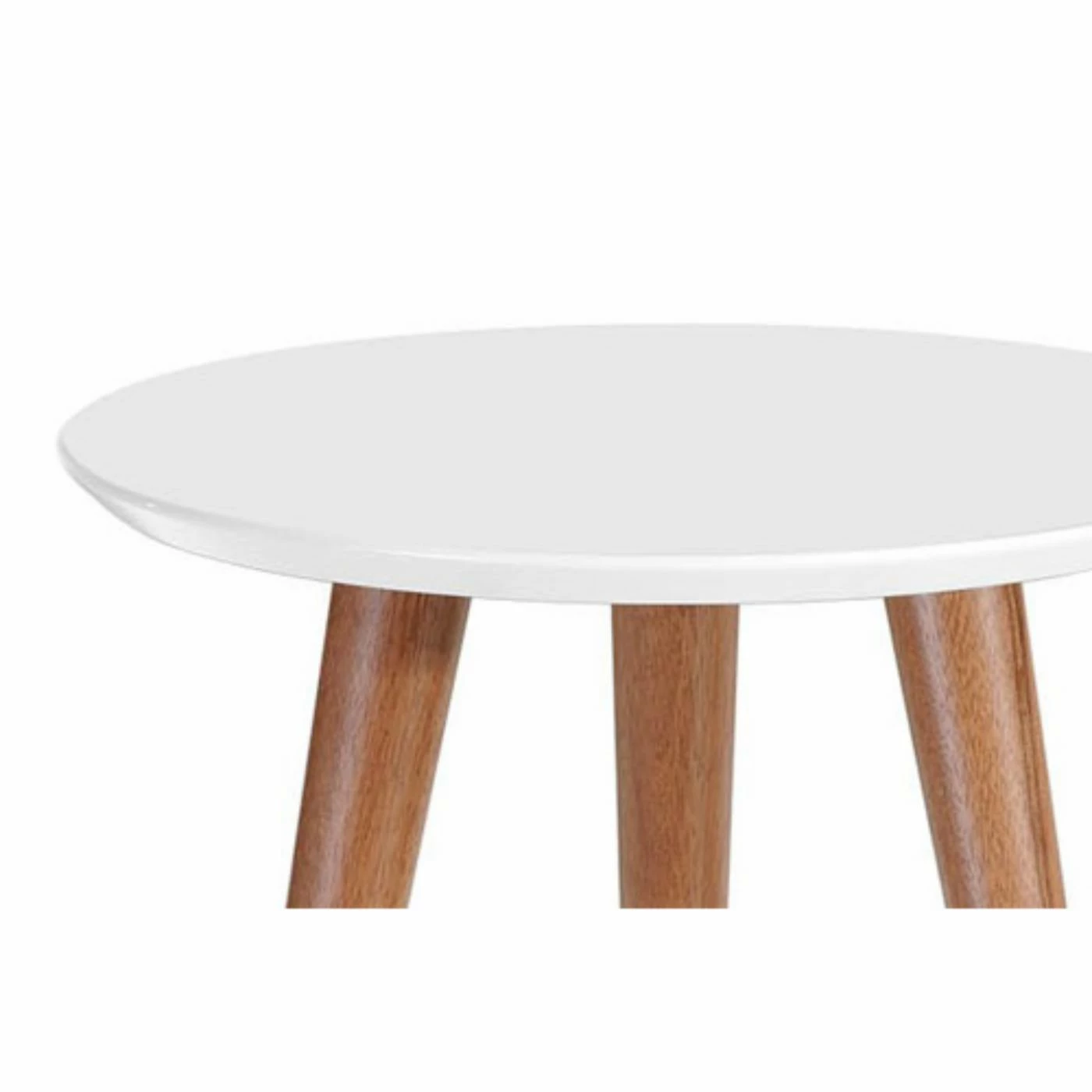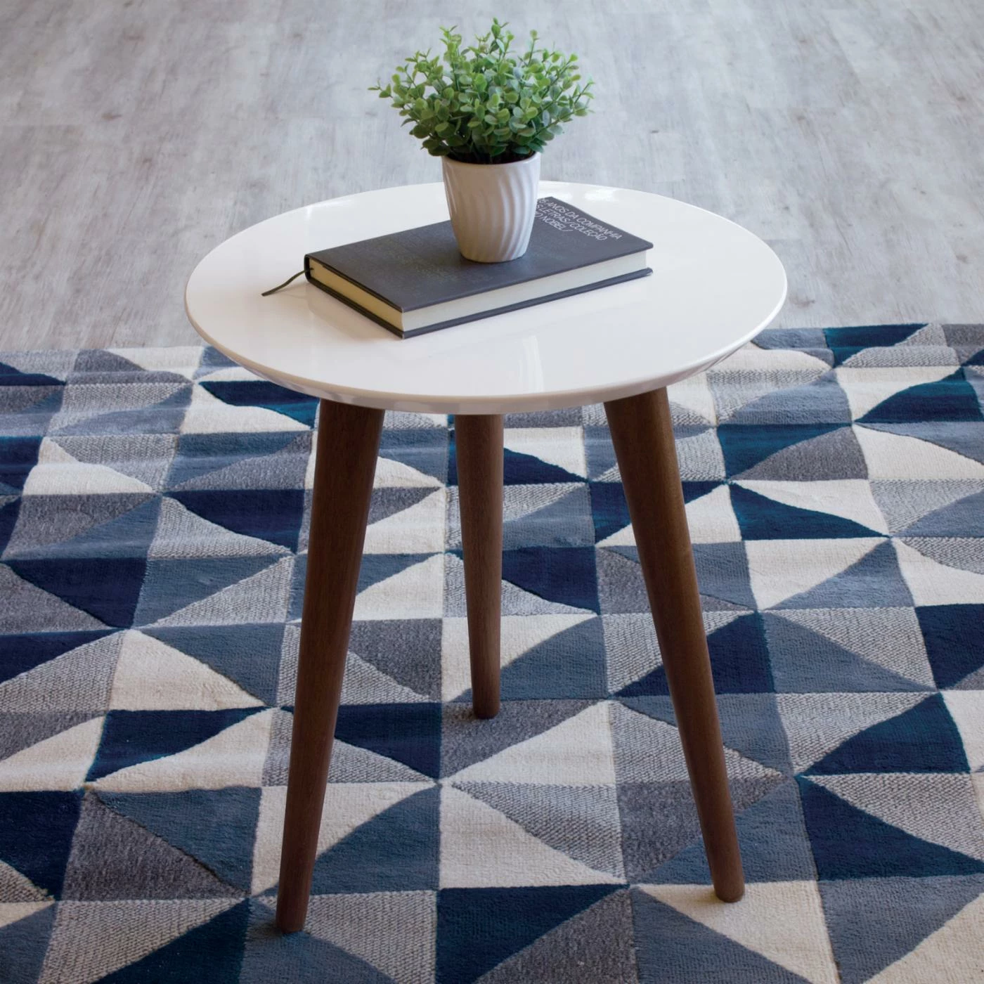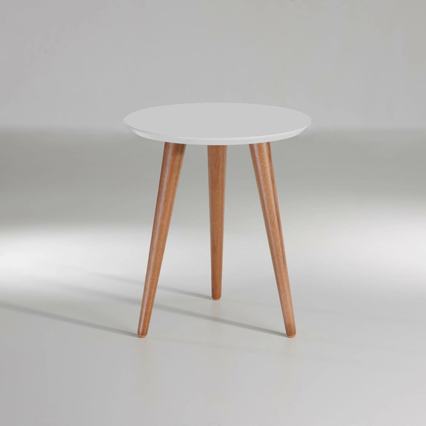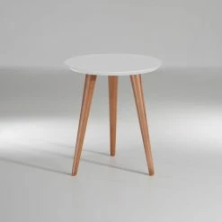 The Manhattan Comfort Moore End Table delicately ties a space together. This round end table features a beveled edge perched atop a mid-century wood dowel tripod leg base. It’s made of engineered wood in choice of available finish options.
