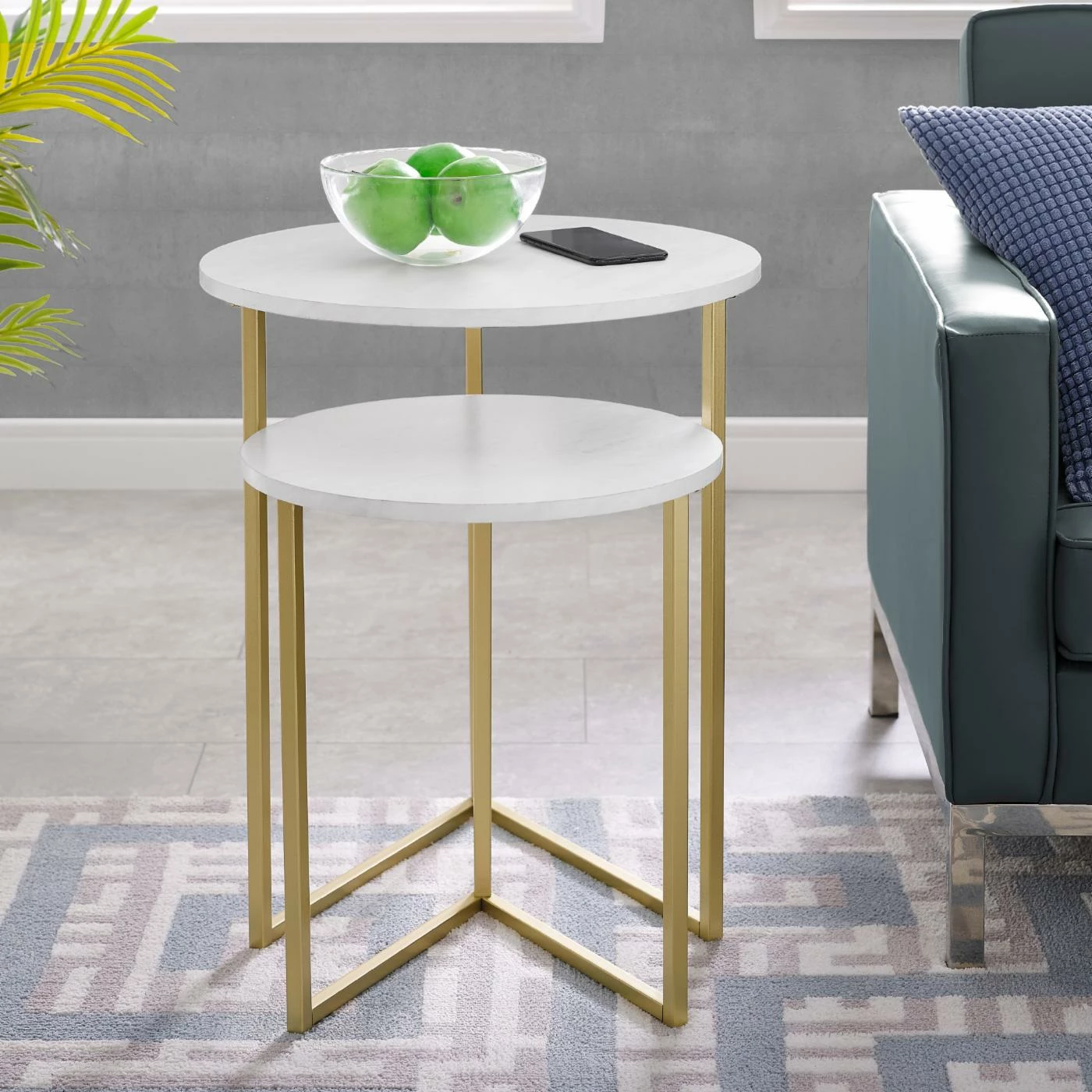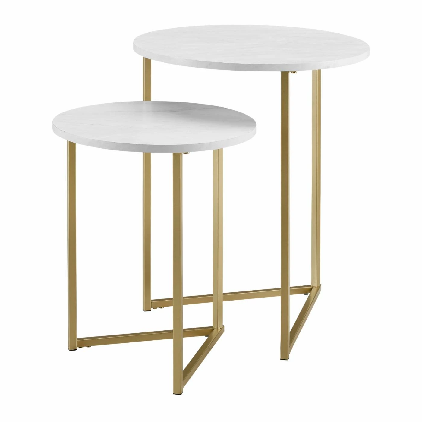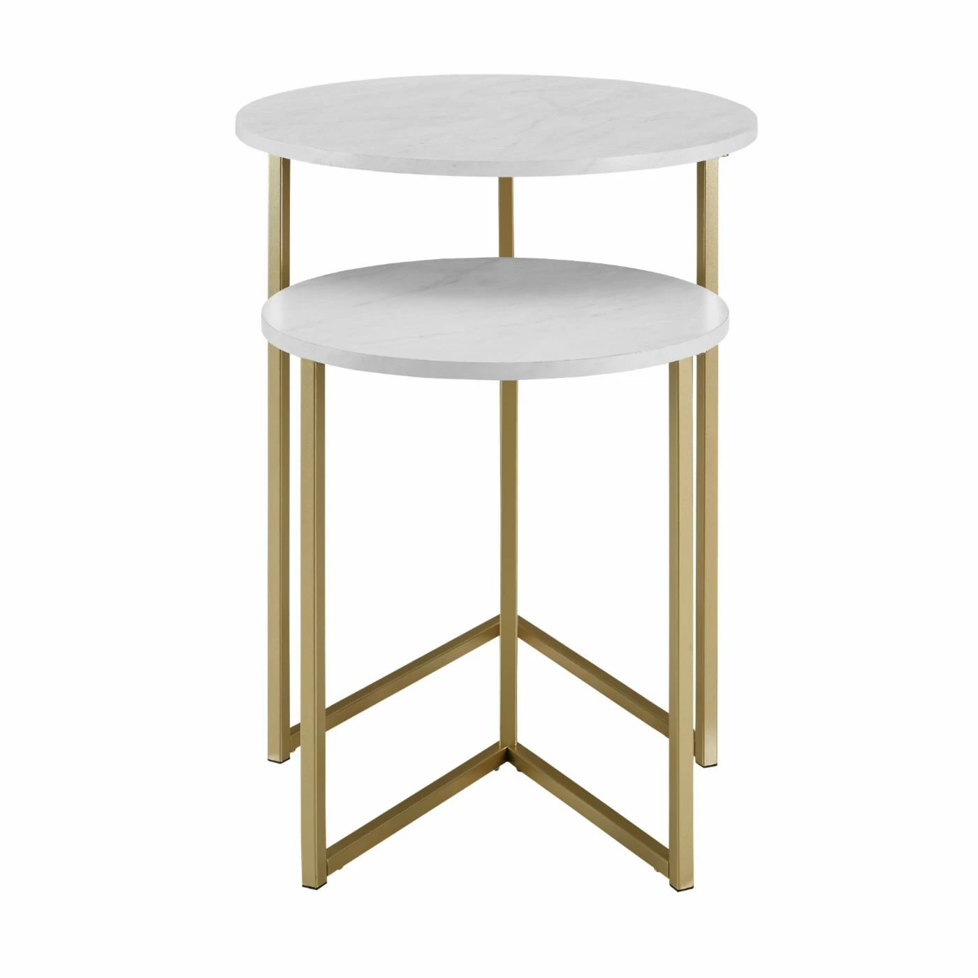 Glam style arrives to your living room with the Manor Park 2 Piece Round White Faux Marble Nesting End Table Set. Use these two nesting end tables together or separately to create a look all your own. The angled legs feature a unique geometric design with sharp edges. These end tables are constructed from engineered wood and laminate in a white faux marble with powder-coated steel bases in gold.