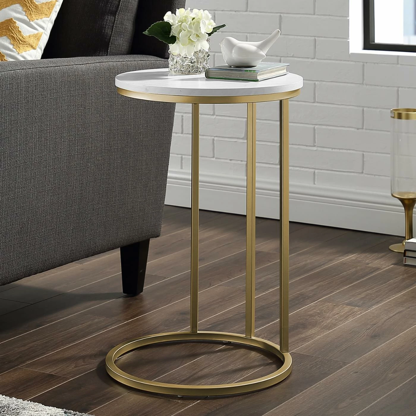 The Manor Park Modern Round C Marble Topped End Table lets you express your modern taste in an understated way. Constructed with a sturdy metal base, this unique design boasts an asymmetrical structure. Faux white marble forms the round tabletop and the frame is finished in a glamorous gold. This versatile piece is perfect as an end table or a nightstand.