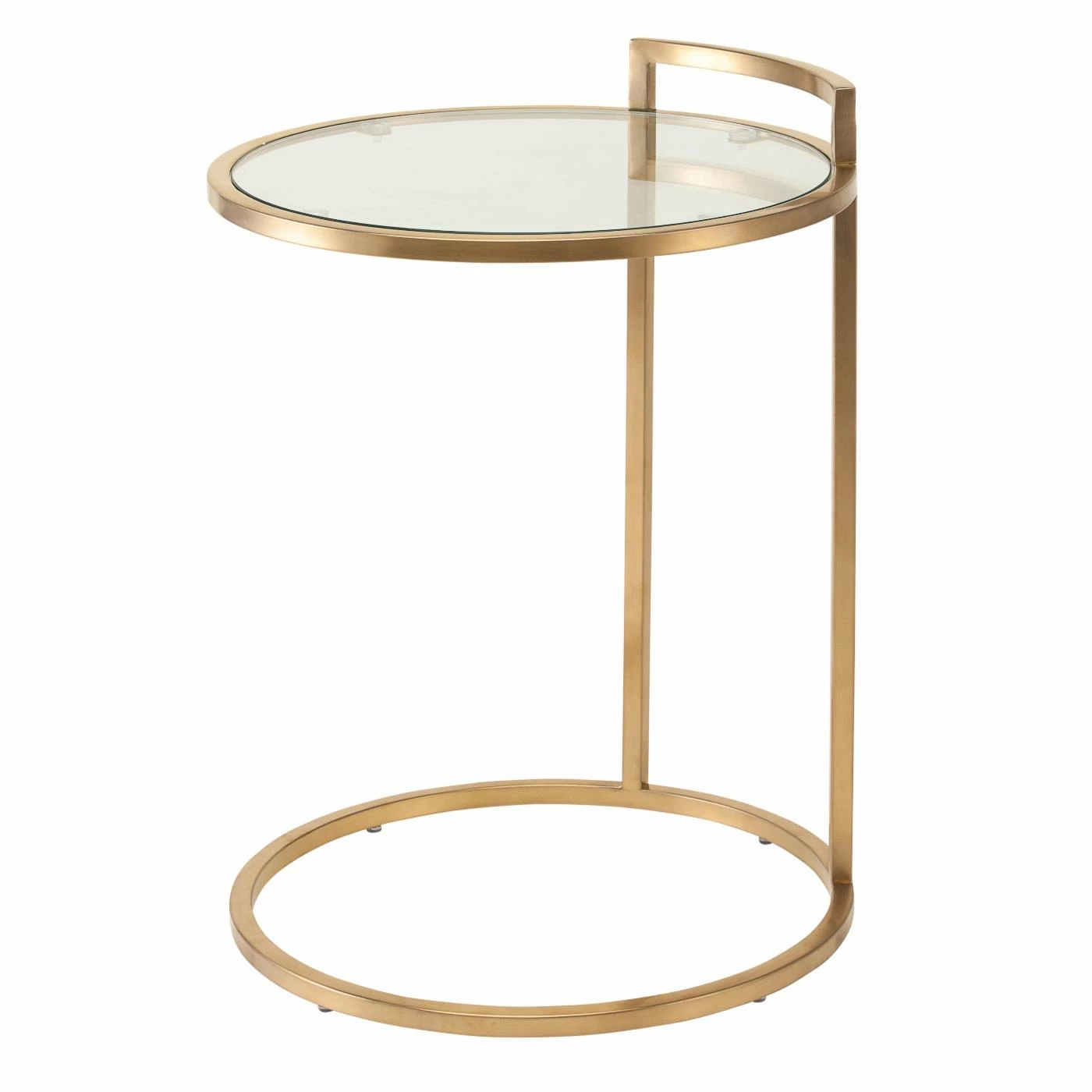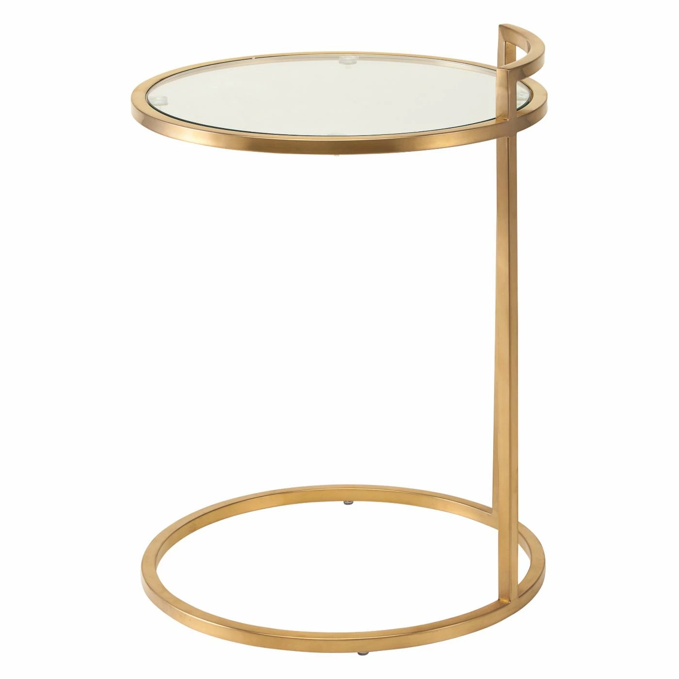 Contemporary in form and built with durability in mind, the Nuevo Lily Side Table is a piece that will leave you in awe. Notice the versatile positions that are available with the one-sided gold base that suspends the glass disk tabletop.