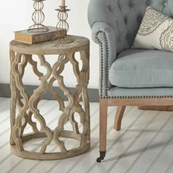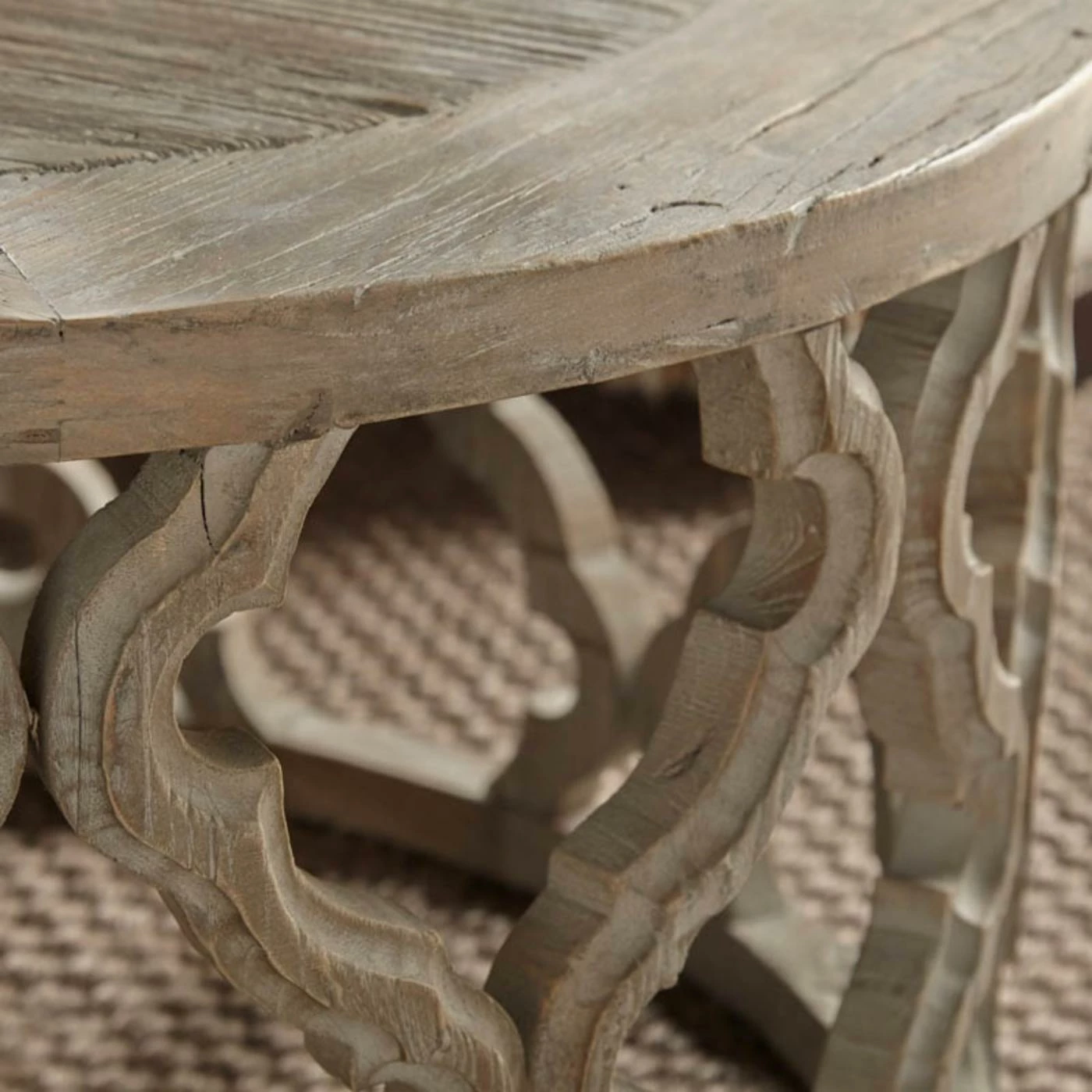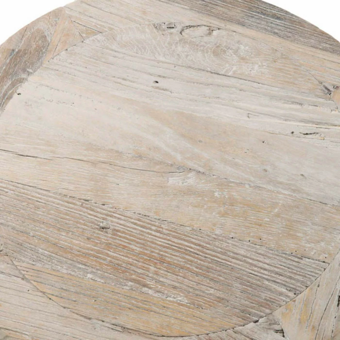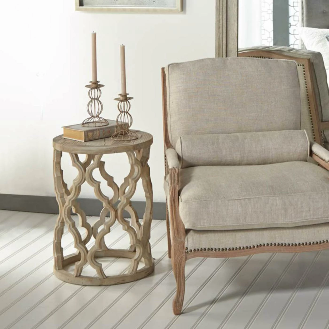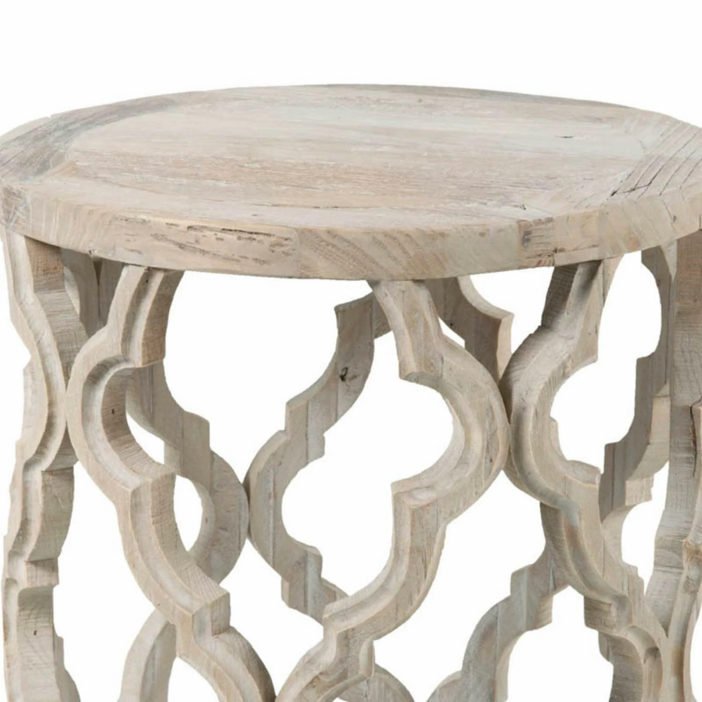 The unique, artistic Orient Express Furniture Clover End Table will bring about a French seaside cottage atmosphere. Reclaimed elm wood is carefully carved into a quatrefoil lattice on the base and is clad with rough-hewn veneers on top. This end table walks the line between furniture and art.