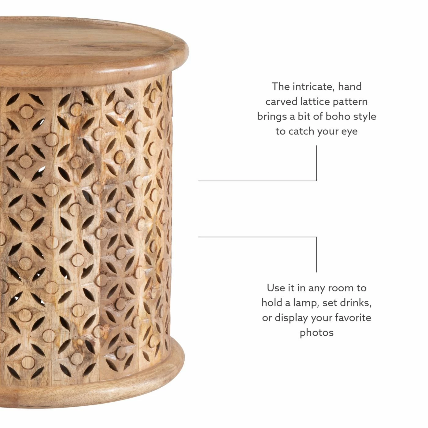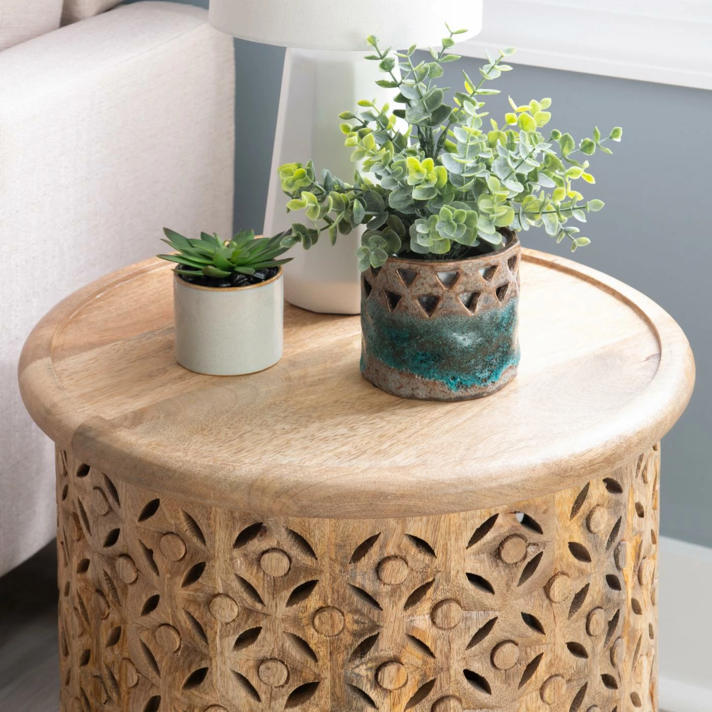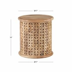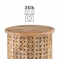 - Round hand carved wood side table