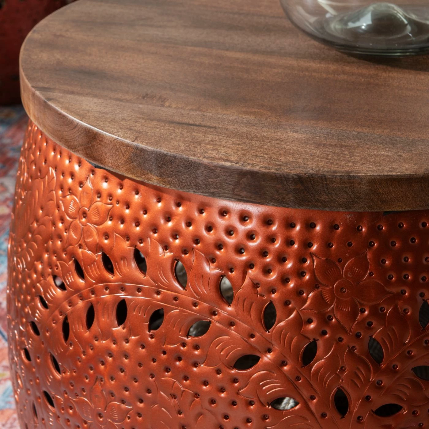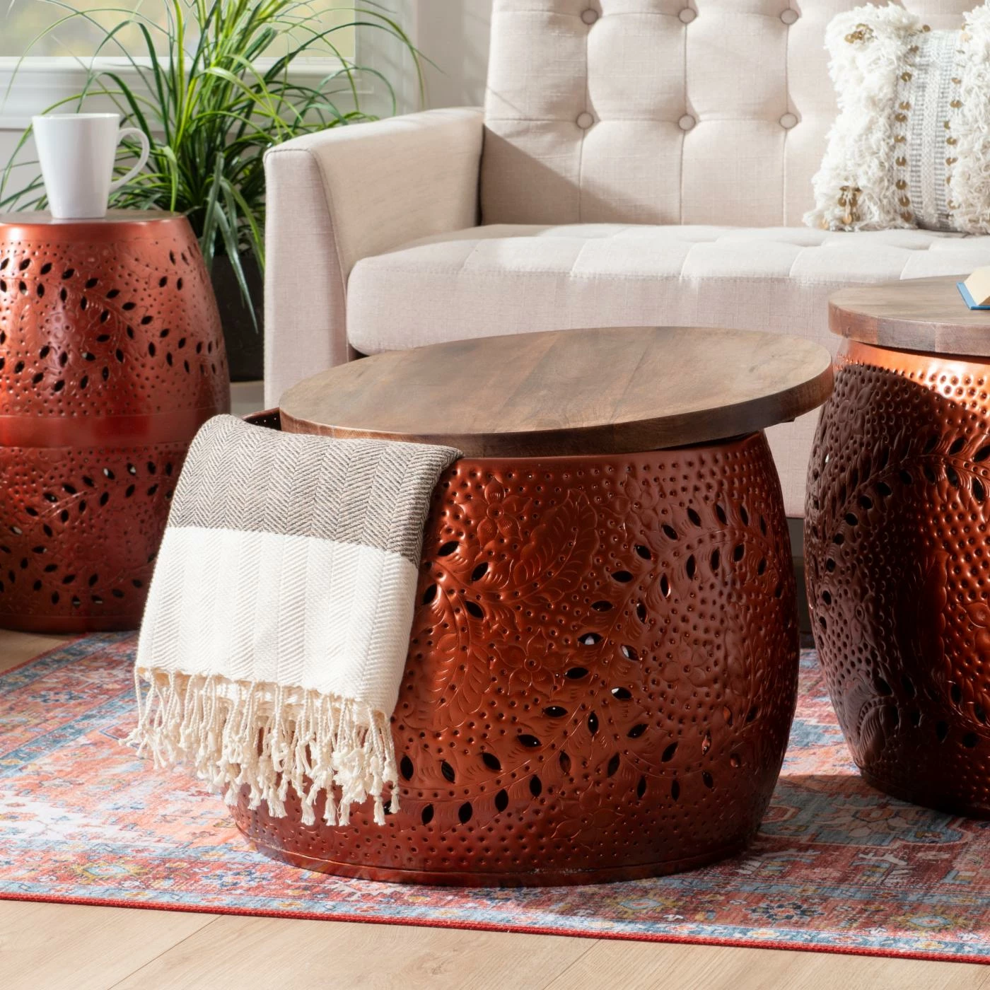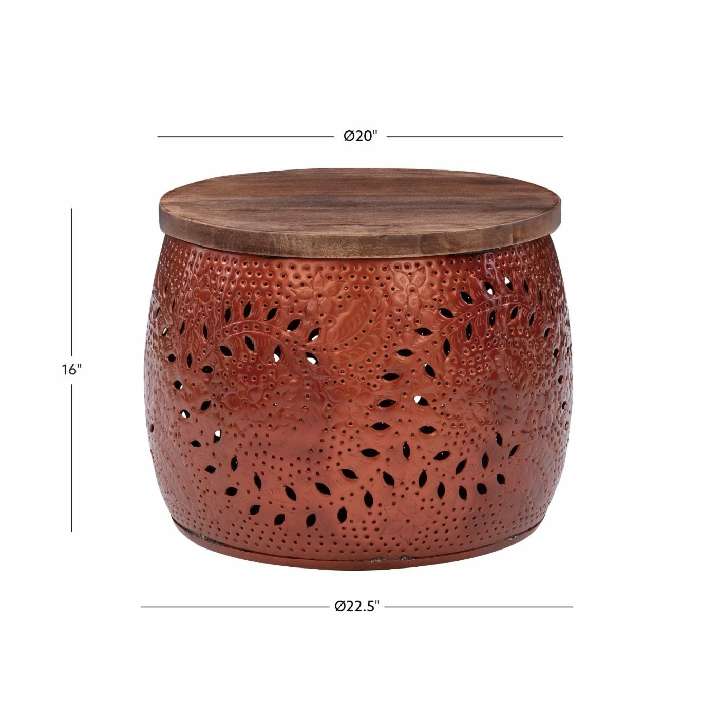 - Solid distressed waved mango wood top lifts up to reveal hidden storage