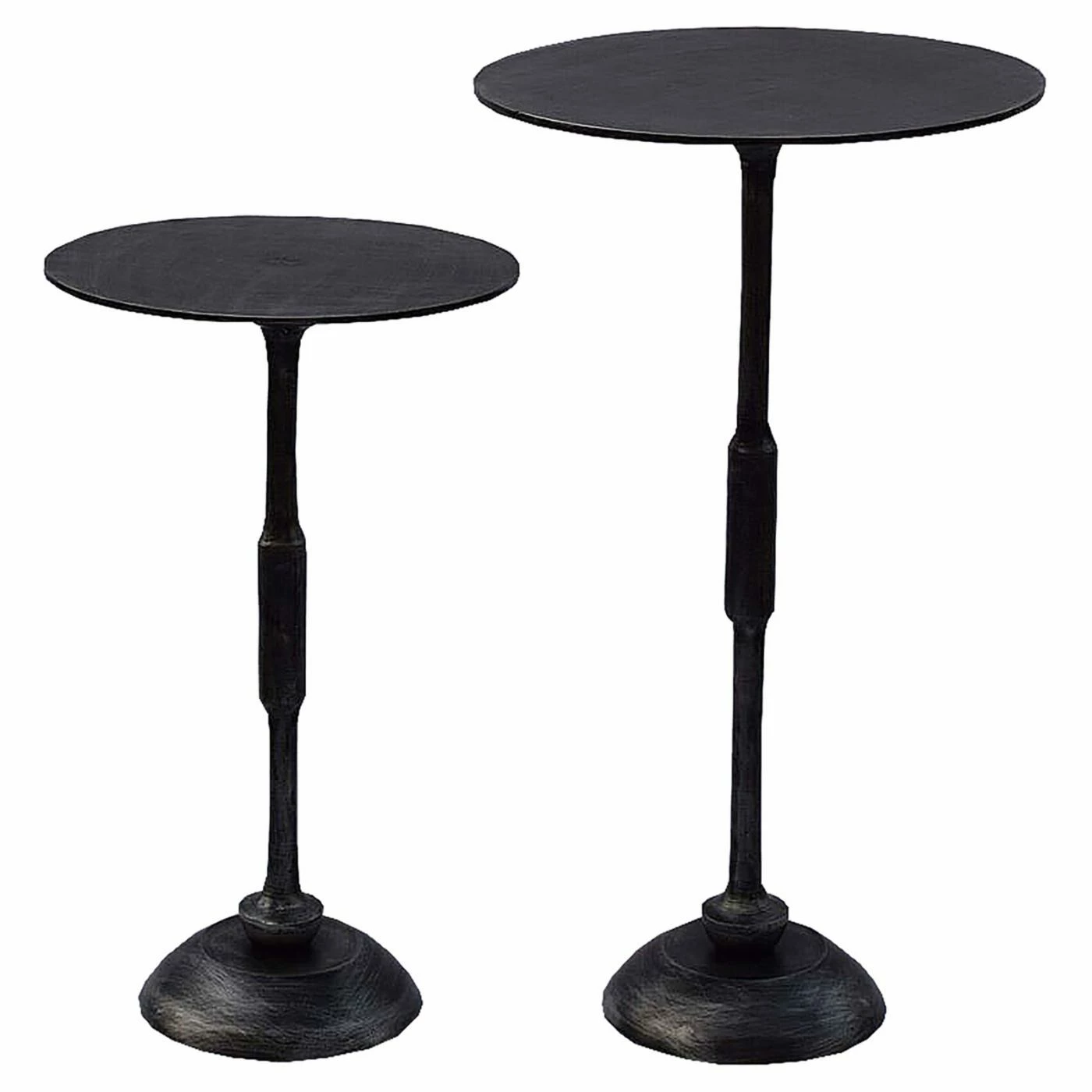 Lend your home unique and stylish accents with the Renwil Bestin End Table – Set of 2. A large and a small table are included in this set, giving you excellent versatility. The tables are built from robust aluminum and feature thin, wide round tops. A decorative stem leg supports each table, terminating in a round pedestal foot. Both tables are topped in an antique charcoal finish with a rough texture for a rustic final touch.