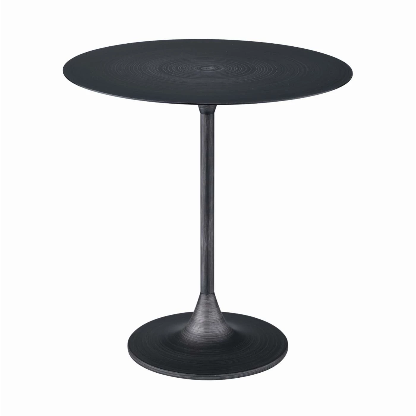 Go all-in with industrial-chic design when choosing this Roundhill Furniture Genoa Round Side Table featuring a distressed-style finish. Sturdy iron material comprises both the base and table top for ultimate strength when holding drinks, snacks, knickknacks, and electronics. A brushed-black finish provides a sleek aesthetic for your room design, while a subtle ascending circular design on the top resembles a vintage vinyl record for a throwback touch. A pedestal-style column holds up the entire table for perfect balance wherever you place it.
