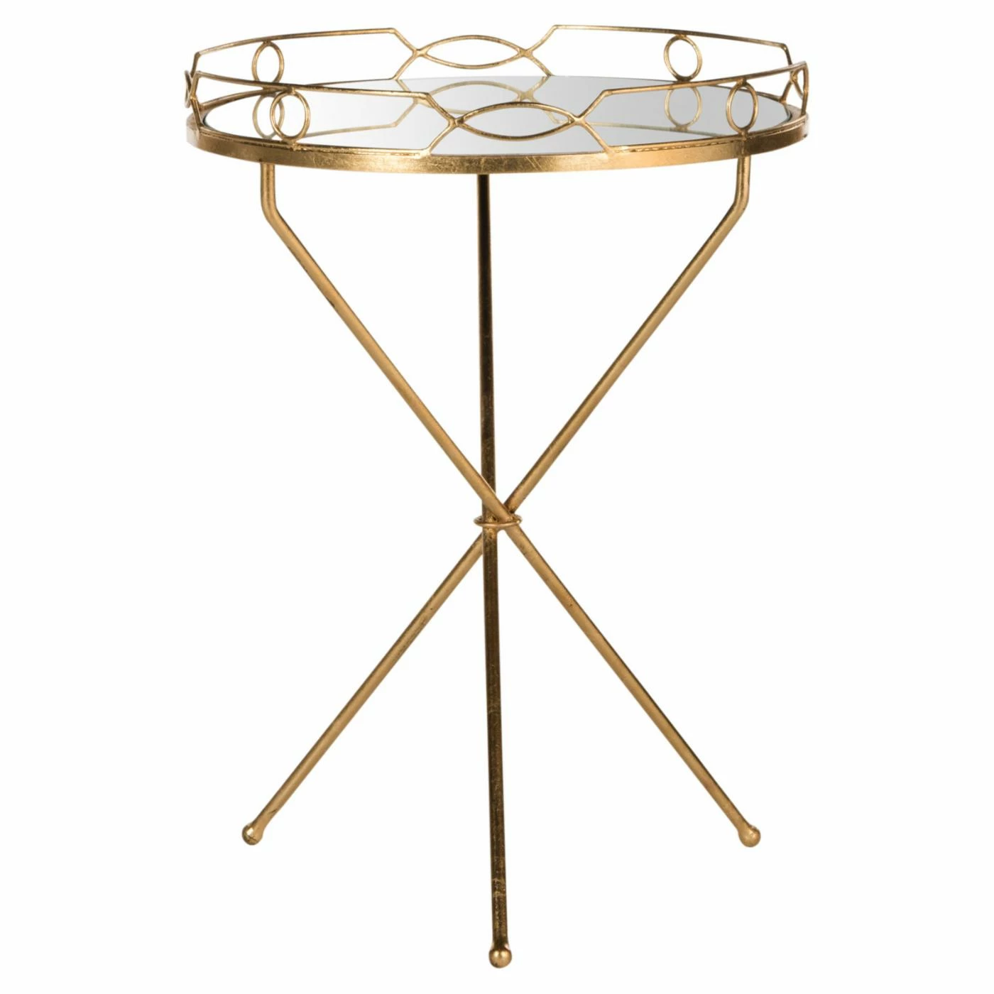 Give your seating area a touch of glamour with the Safavieh Cherris End Table. The tripod iron base glows with a warm gold finish, and the round top is surrounded by an elegant iron-filigree gallery rail. Mirrored glass lends a sleek, reflective quality to the end table and will draw the eye to whatever you display on the top.