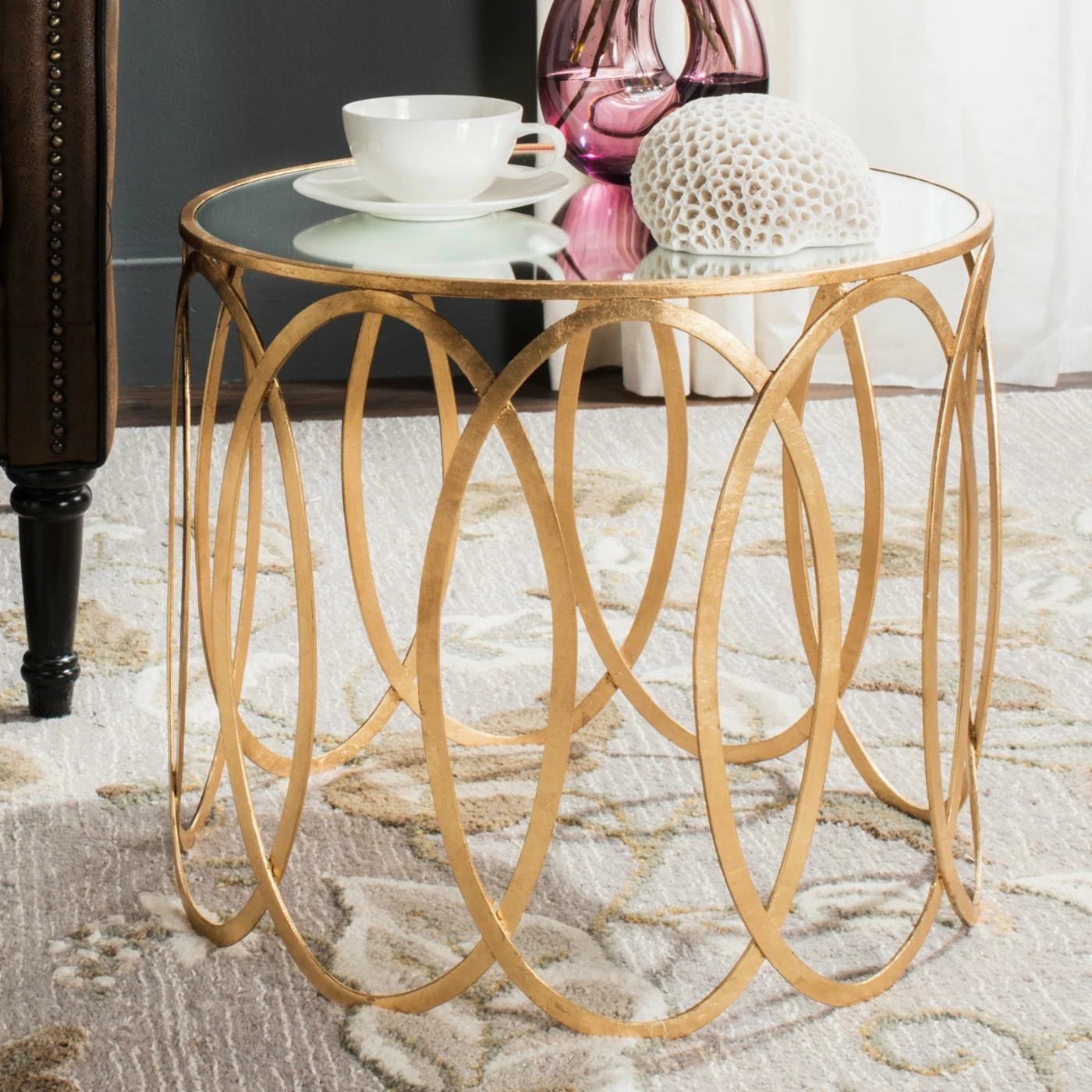 Make a dramatic statement in your seating area with the Safavieh Cyrah Gold Leaf Accent Table. Crafted out of iron, the base of this transitional table is formed out of interlocking oval rings finished in warm antique gold leaf. Clear tempered glass shines on the top.