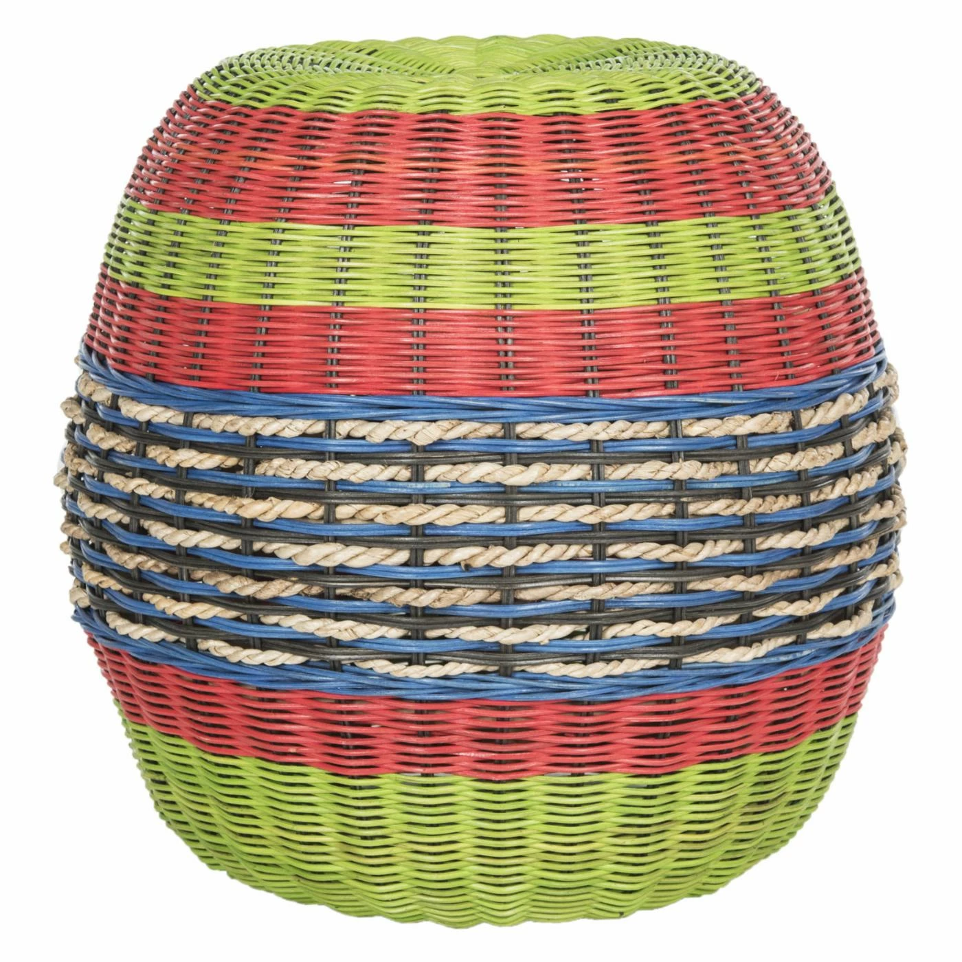 Maximize the amount of color in your living space with the vibrant look of the Safavieh Nikos Wicker End Table. Patterned after the colors and textures of Bolga baskets produced in Ghana, this global chic piece shows off tones of green, red, blue, black, and natural beige. The artisan-crafted table features a banana leaf and rattan pole weave over top of a durable rattan core.