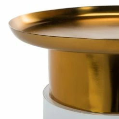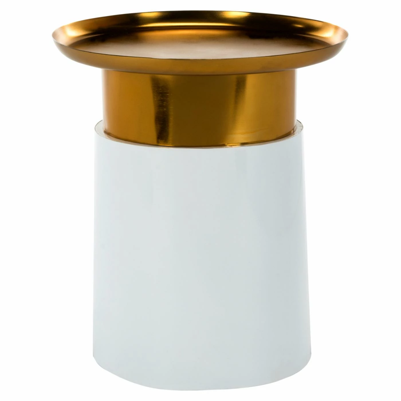 Lend your living room a sharp, chic touch with the Safavieh Zenith Tray Top Side Table. This handsome side table provides a perfect place for arranging a sculpture, vase, or just setting drinks. The wide round top features a raised tray lip to help keep everything aboard. The top is crafted from robust metal while the base is built from lightweight and durable engineered wood. A polished gold finish anoints the top, complementing the glossy white of the base.