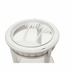 The Sea Winds Monaco Round End Table lends a classical feel to your space while allowing you to customize the look to fit your personal taste. This table is crafted from solid hardwood with lathe-turned legs, bun feet, and trim molding. The open top is covered with a sheet of tempered glass over a carved inset. This inset is offered in a variety of available styles to give you a look that fits the theme of your space. The entire body is finished in classic white with subtle distressing.