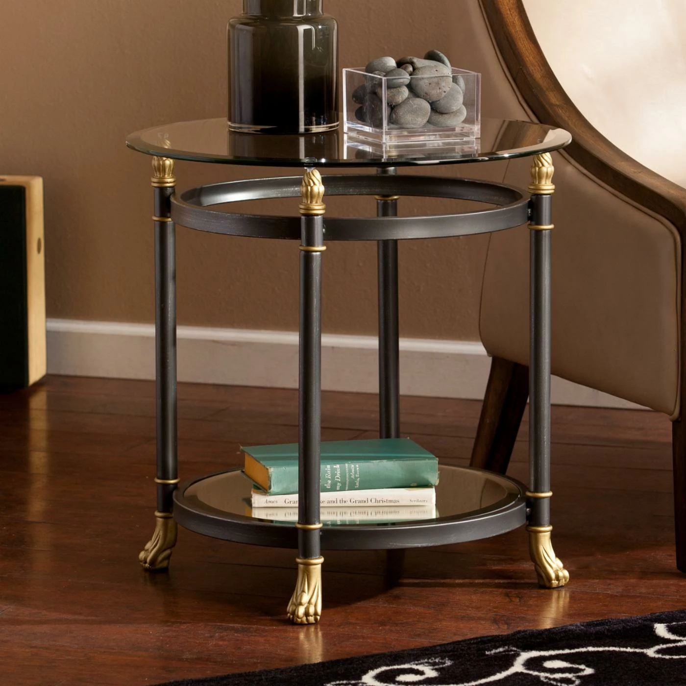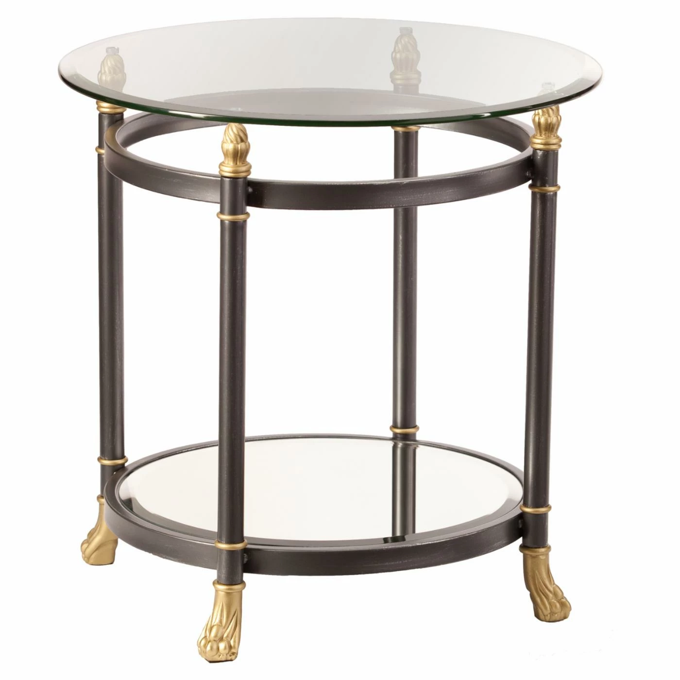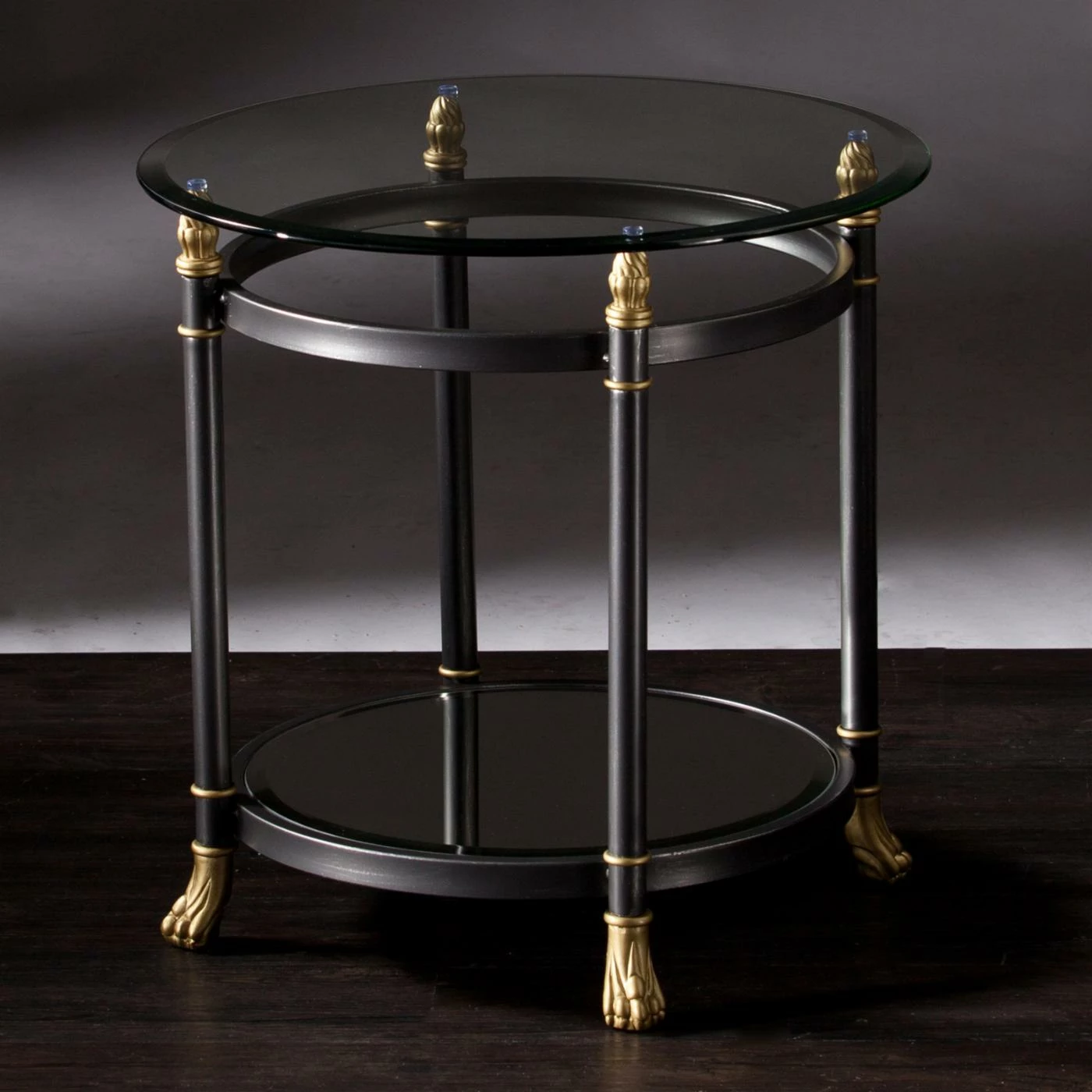 The classical and round Southern Enterprises Allesandro End Table gets its inspiration from vintage Hollywood glamour. Designer details include regal claw feet, shapely finials, and an airy beveled glass top. This end table features a dark gray, matte finish with silver distressing and gold highlights. Its beveled, mirrored shelf below adds extra space for display pieces.