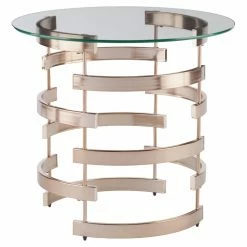 The Southern Enterprises Belmar End Table brings its contemporary glamour into your living space. This end table has a cylindrical, interlocking base in a luxe champagne finish. It’s topped by thick, clear glass for an airy feel.