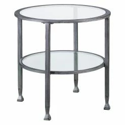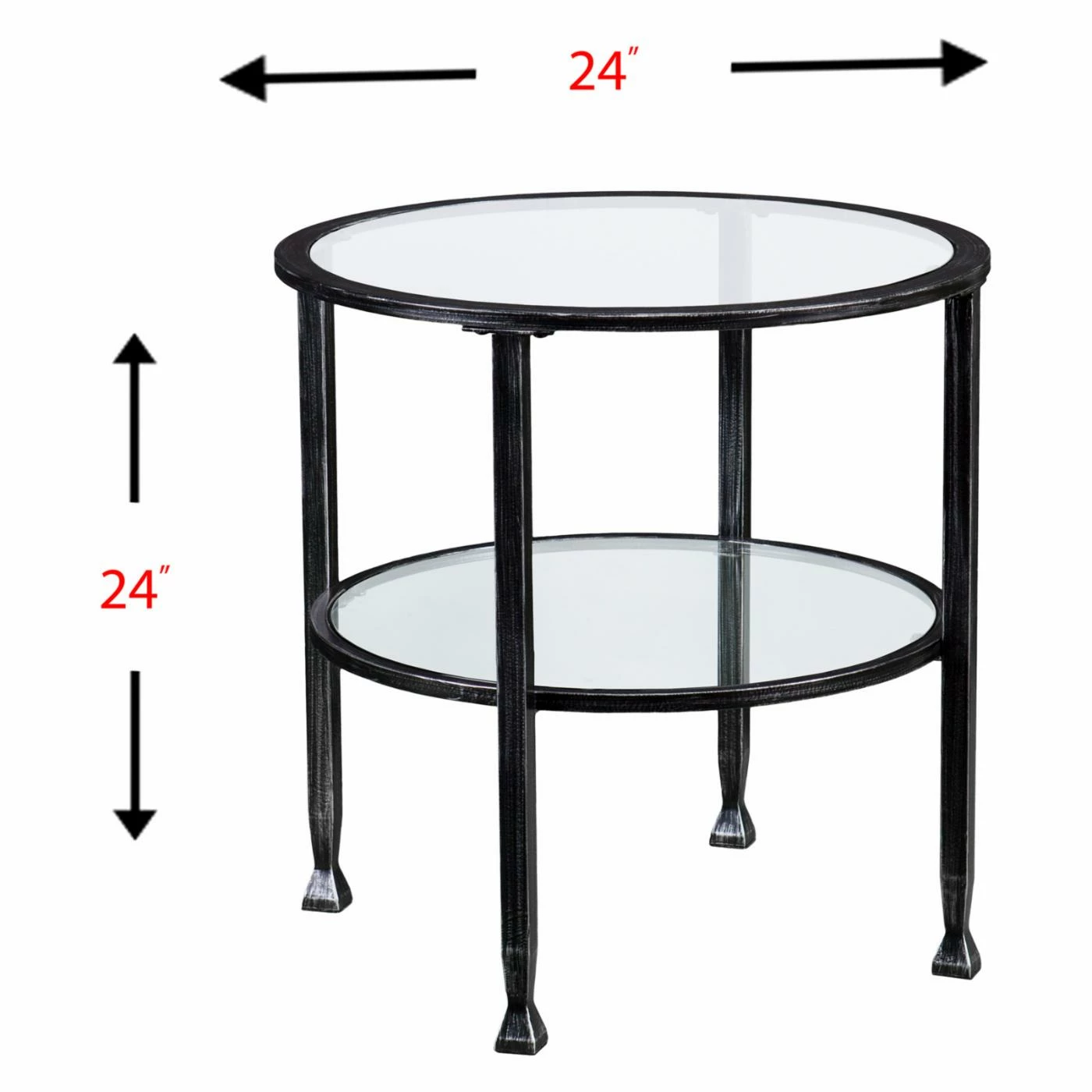 A versatile chairside companion, this Southern Enterprises Jaymes Metal / Glass Round End Table comes in finish options so you can find the right style for your living room. This round end table has a clear tempered glass top and lower shelf for double the display space. At 24-inches across, it’s just the right size to fit between two chairs or beside your sofa.
