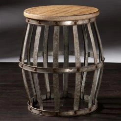 The rustically chic Southern Enterprises Mencino Accent Table was inspired by wine barrels and industrial design. Its barrel-shaped frame is made of galvanized sheet metal in an antique silver finish with rust nail head accents. The round wooden top is also thoroughly distressed. The open area inside offers space for creative displays or may be left open.