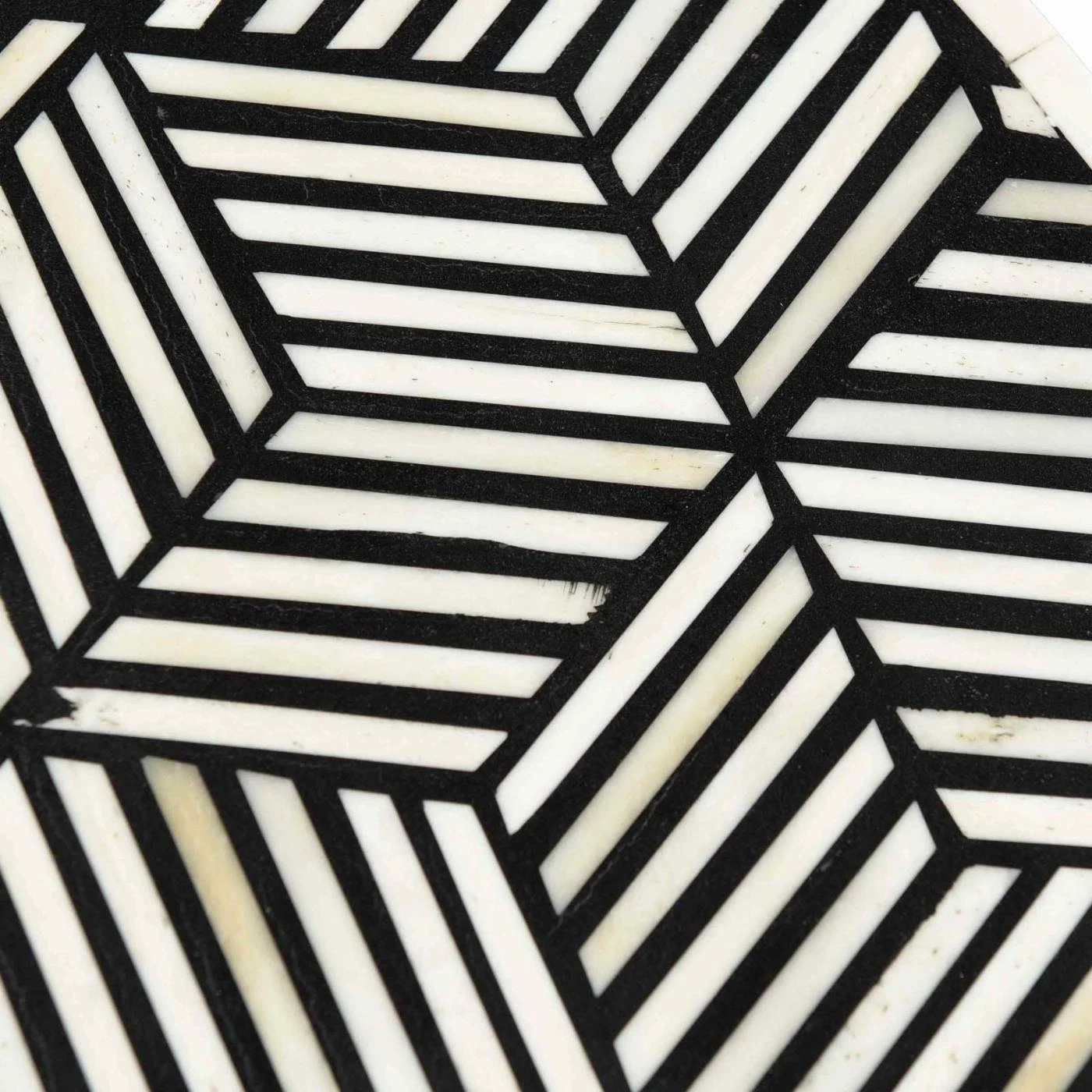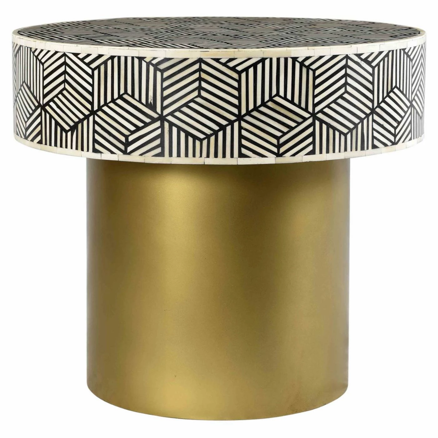 Give that vintage tuxedo sofa a faithful companion in the TOV Furniture Bone Inlay Drum Side Table. This round table has a lightweight, overhanging top made from engineered wood. The round base is built from thick iron with a handsome brass finish. The top comes with a black/white hatched-line cube design made from inlaid bone.