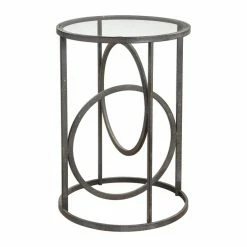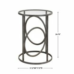 The industrial glam Uttermost Lucien Iron Accent End Table is hand-forged of iron. Its interlocking rings base is finished in a textured aged black with chic gold highlights. It’s crowned by a clear glass round, transforming it from sculptural art to practical end table.