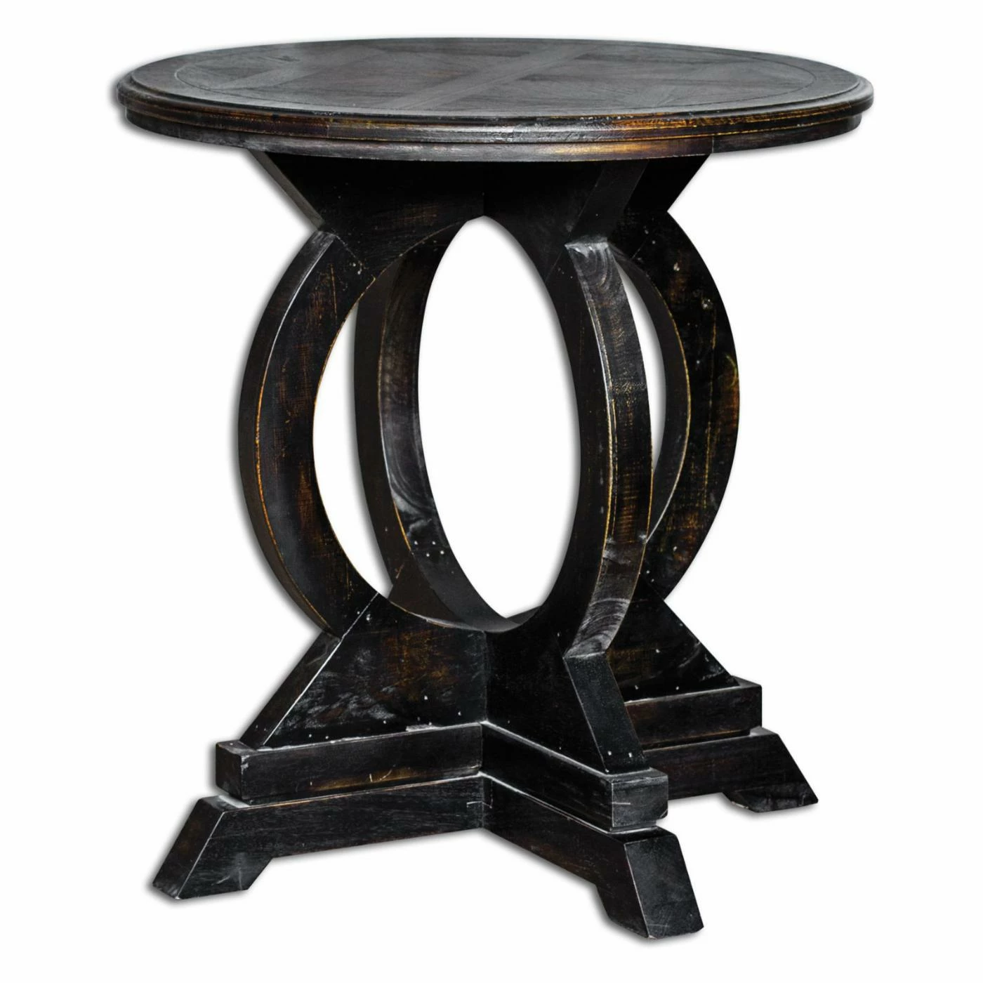 The open circle motif base of this Uttermost Maiva Accent Table makes it a distinctive addition to your home. The striking circular top features an intricate mindi veneer inlay. This mango wood accent table is graced by a weathered black finish with rub-through distressing.