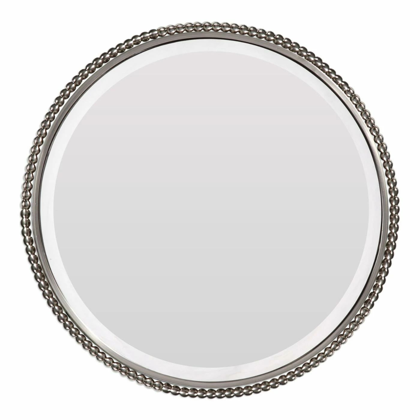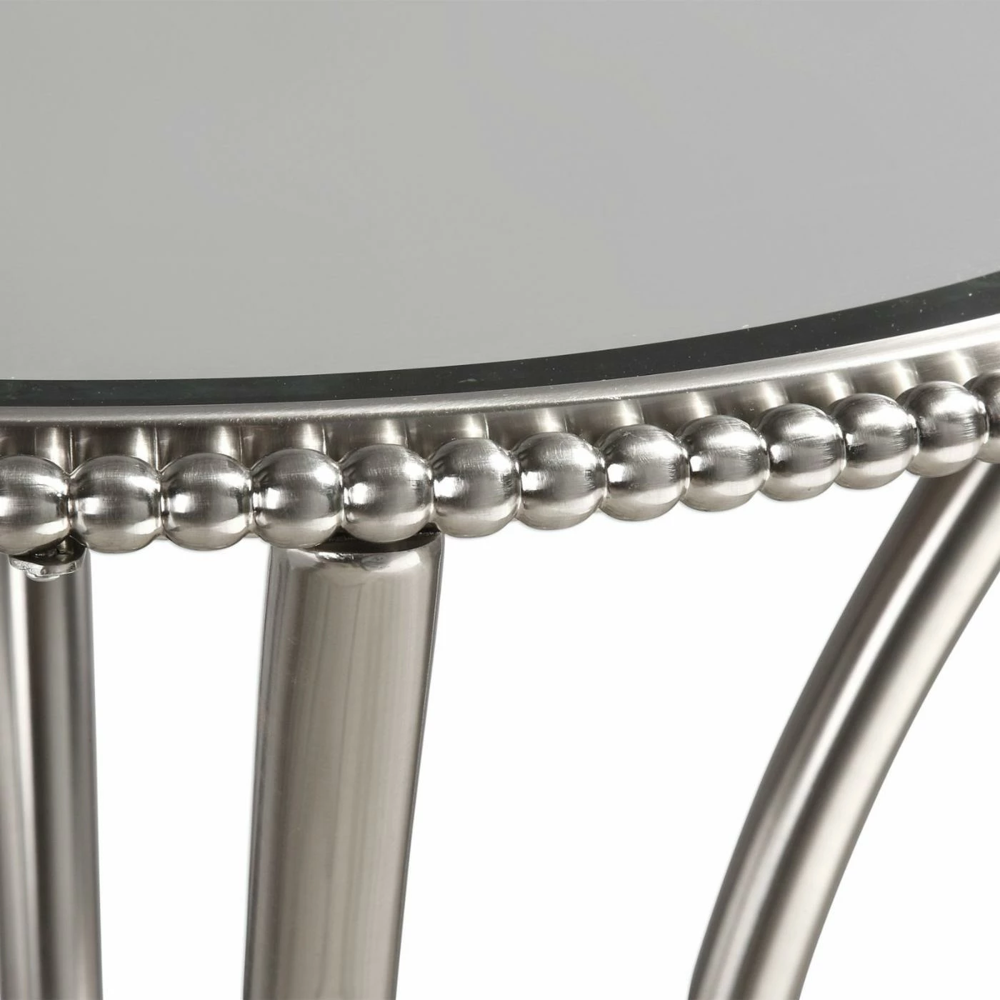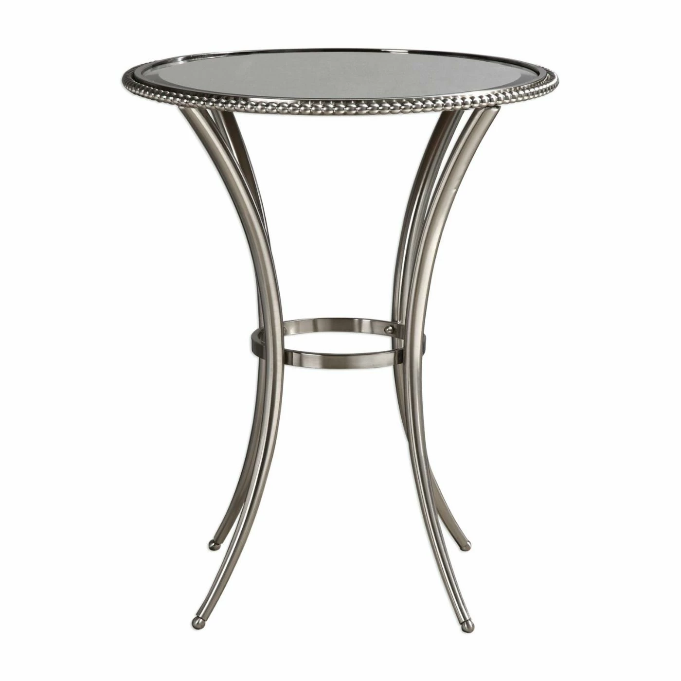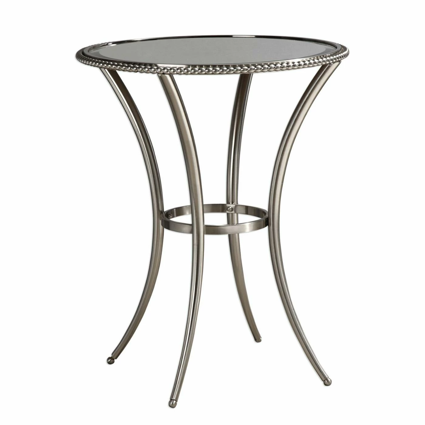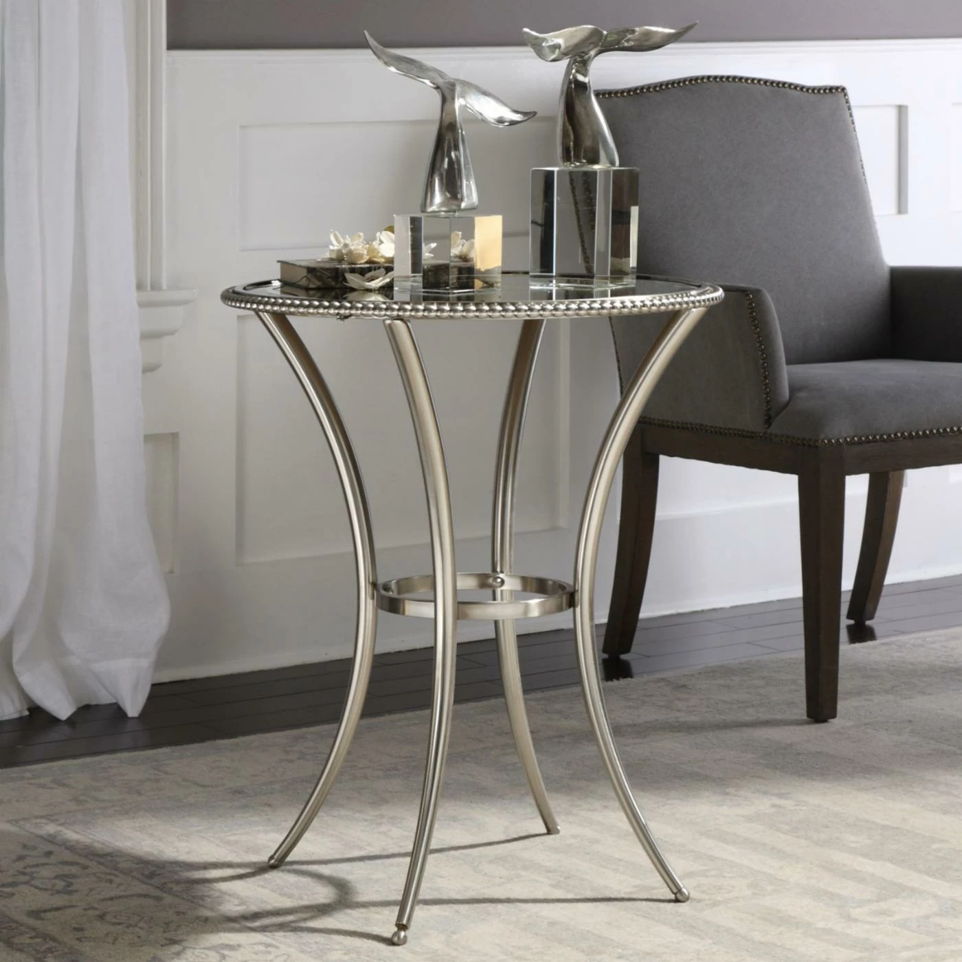 Adorn the space beside your favorite arm chair with the Uttermost Sherise Beaded Metal Accent Table to create a welcoming, relaxing atmosphere. This accent table is crafted of durable beveled glass and features a sleek metal frame with flared, angled legs. Beaded metal trim along the table top and a plated silver finish lend a touch of vintage allure to your dΓ©cor.