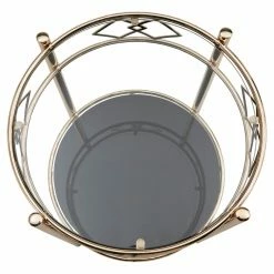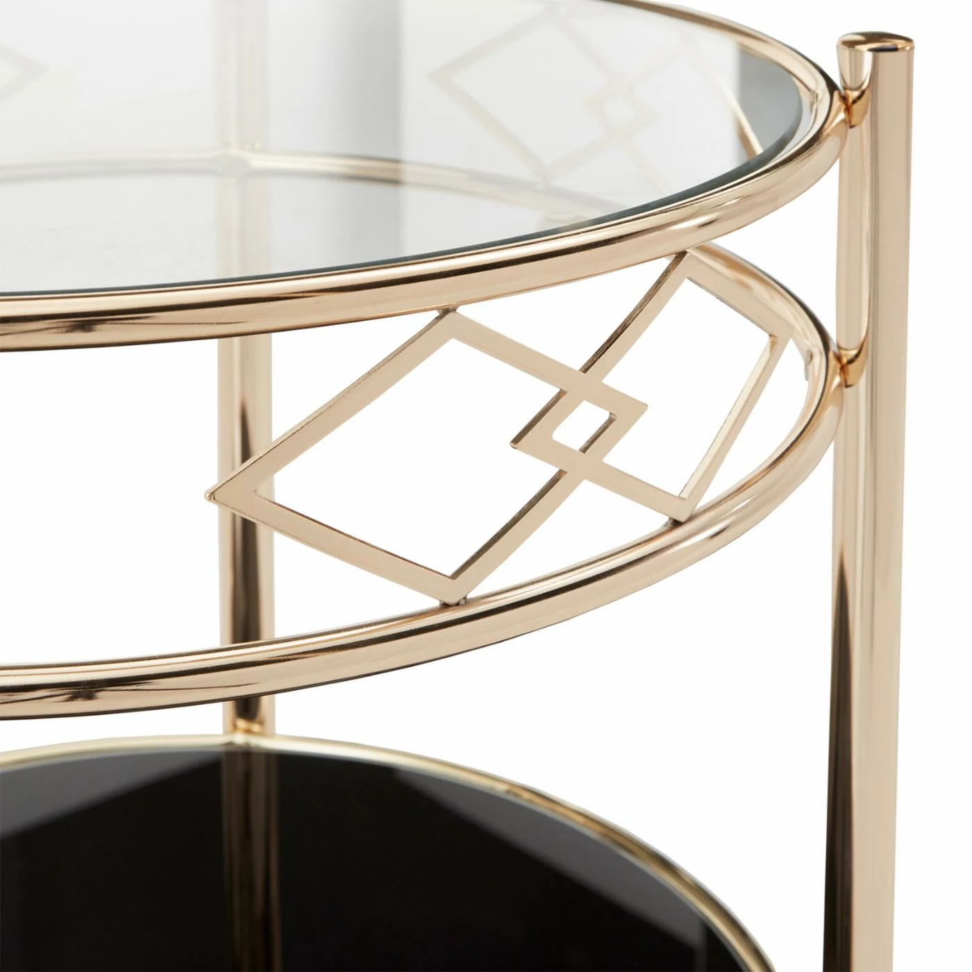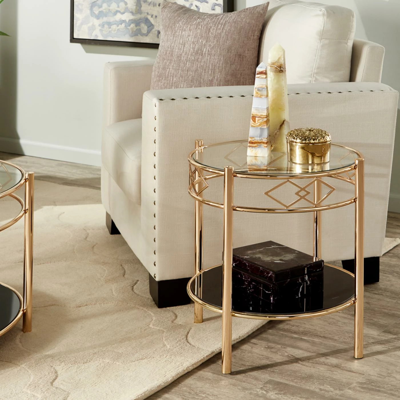 Supple curves and a dazzling polished color make the Weston Home Tabita Chair Side End Table an exciting complement to your living room or lounge. The round table is constructed from tubed metal, featuring an open apron with diamond detailing. A rose gold finish emphasizes the chic curves and catches the light magnificently. The round top is made from clear tempered glass while the base has a smoked black color.