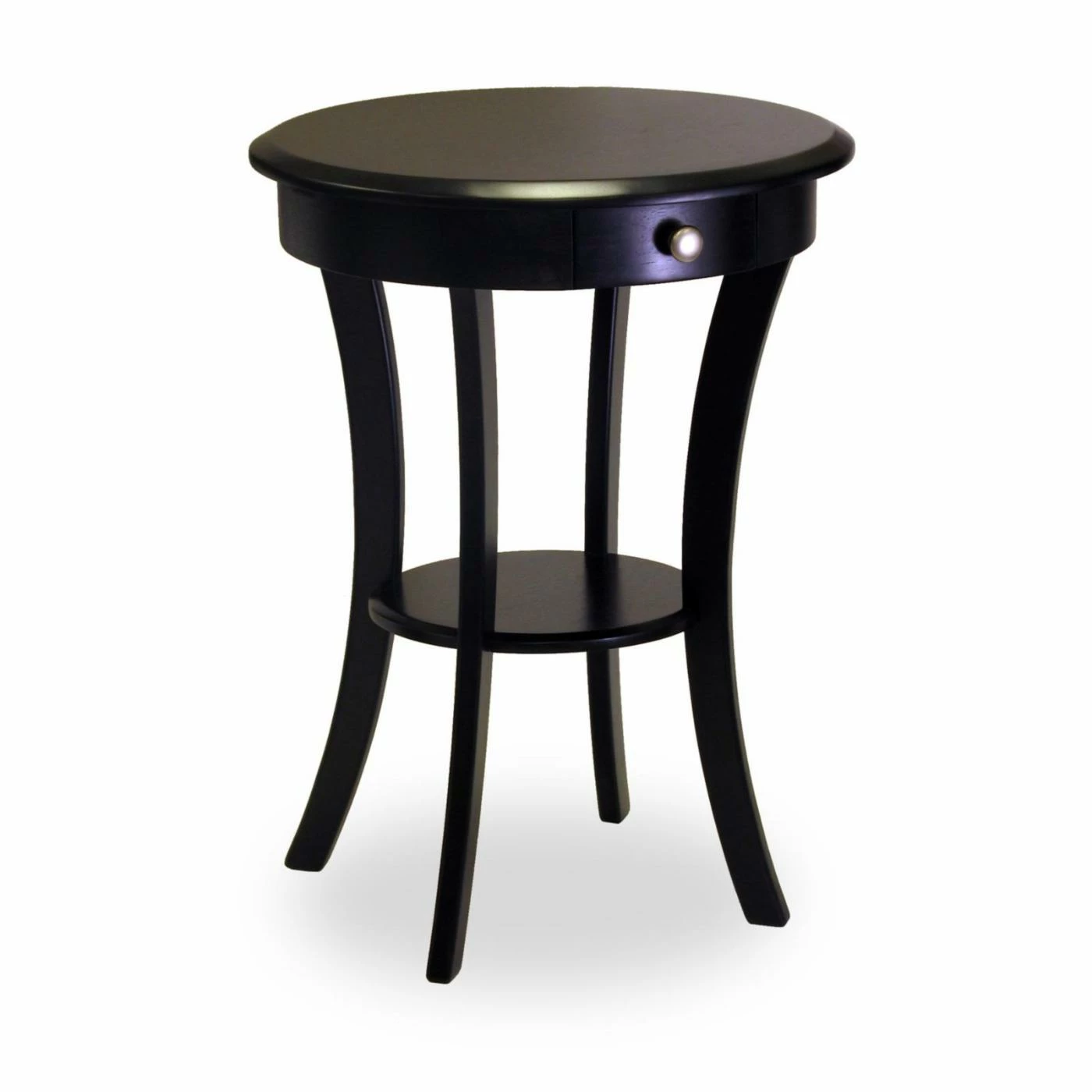Curves are cool with the Winsome Hartland End Table. Made of solid wood with a glossy black finish, this round end table has a curved drawer built into the front with a silver metal knob. A round plant shelf at the bottom is supported by the four legs, which curve inward and taper outward at the bottom. This traditional end table blends well with any decor and is ideal for lamps and flower vases. Use it in your living room, dining room, bedroom, any room.