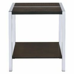 Update your living room with the Acme Furniture Jethro End Table. Metal tube chrome legs contrast with the dark brown finish of the top and bottom shelf to create a look that draws the eye. Use the bottom shelf to hold magazines or decorative items, while the top is perfect for a lamp or small curios.