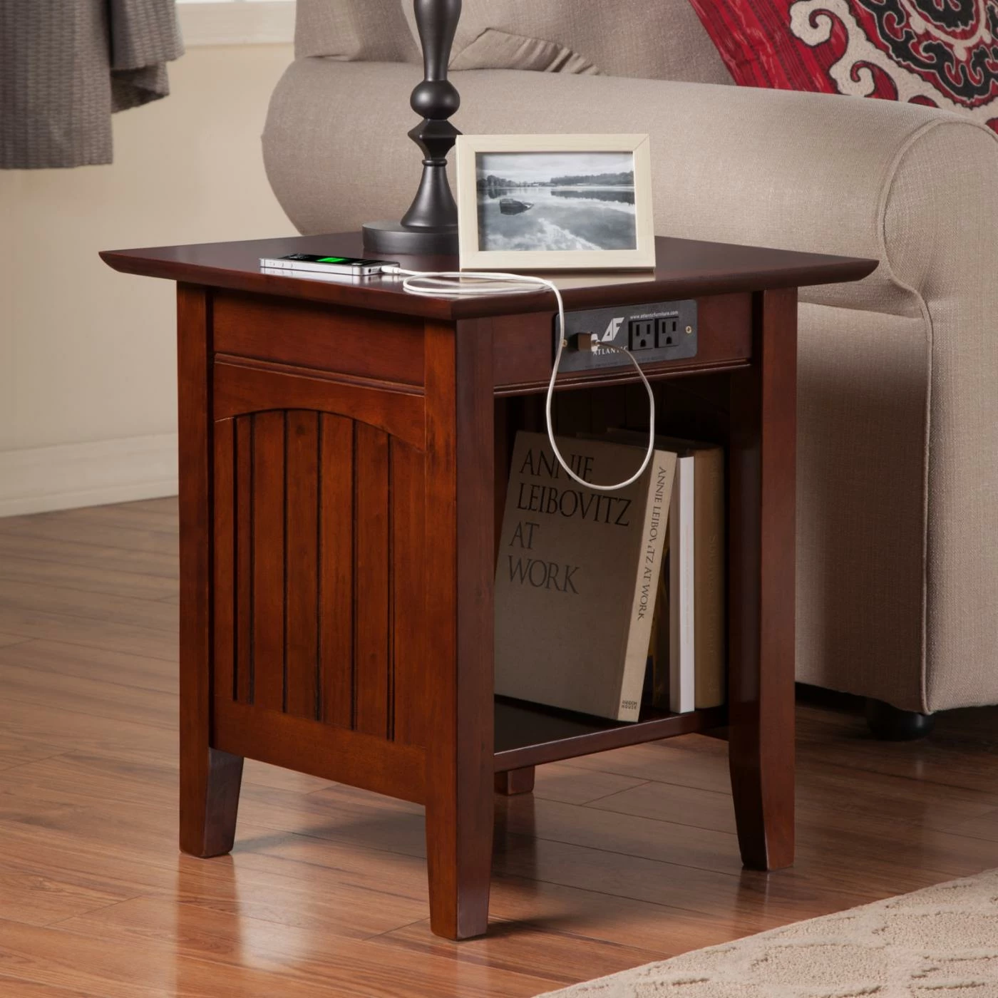 A cottage charmer, this AFI Furnishings Charlotte End Table with Charging Station boasts casual paneled sides and a classic arch detail. This end table is updated by its built-in charging station with two USB ports and two electrical outlets. The end table is well-crafted from solid, eco-friendly hardwoods and is available in a variety of finish options.