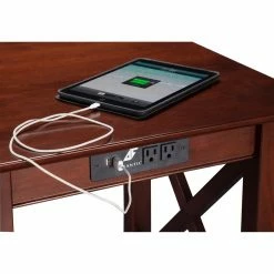 A multi-step finish, in your choice of available color, gives it a rich tone that highlights the natural beauty of the hardwood. On the apron is an integrated panel that gives you a pair of standard, 110-volt outlets along with two USB charging ports. A grounded nine-foot cord lets you plug in the table to power the charging station and make this a central part of your daily routine.