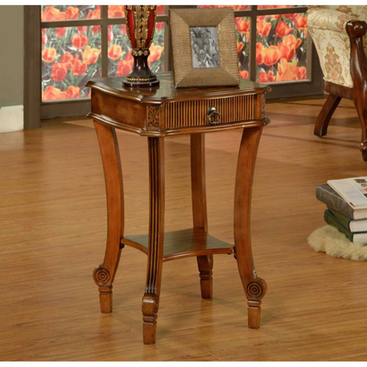 The intricate details carved in the All Things Cedar Accent Furniture Designer End Table make it stand out in any room. This beautiful table features an elegant cherry finish on the birch veneers and solid wood legs. The edges of this end table feature a flower design that flows down to the deep lines etched in the legs. These deep lines are etched into the storage drawer as well. The lower shelf is perfect for displaying items or for extra storage. Some assembly is required for this traditional end table.